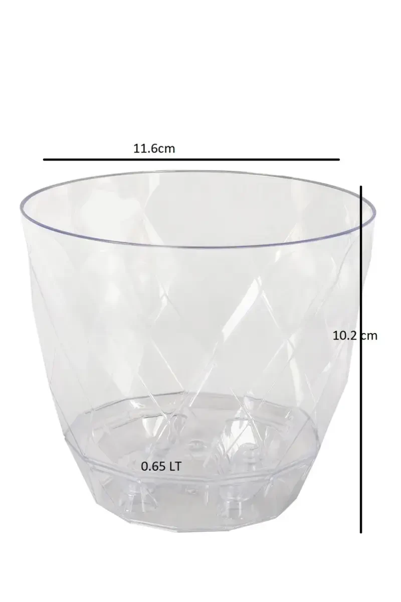 Meet the 0.65 lt Diamond Patterned Plastic Crystal Yakamoz Orchid Pot No1, specially designed for those passionate about orchid cultivation, combining aesthetics and functionality! This pot will support the healthy growth of your orchid plants while adding elegance to its environment, making it an eye-catching detail in your home or office.**Product Description**Orchids are delicate plants that require special care, and choosing the right pot is critical for their healthy growth. The Diamond Patterned Plastic Crystal Yakamoz Orchid Pot No1, with its ideal size of 0.65 liters, offers an area where orchid roots can develop comfortably. Thanks to its transparent structure, you can easily observe the condition of the roots and better determine the need for watering. In this way, you can keep your orchid's health under control and prevent problems such as overwatering or drought. The diamond pattern design gives the pot a modern and elegant look. This aesthetic detail turns the pot from just a plant container into a decorative element. Its crystal appearance reflects light, adding a pleasant sparkle to the environment and highlighting the beauty of your orchid. The Yakamoz effect provides a visual feast by making the pot look different colors from different angles.Made of plastic material, the pot is lightweight and durable. This feature guarantees that the pot can be easily carried and has a long life. In addition, the plastic material is easy to clean and provides a hygienic environment. This is important for the healthy development of your orchid. The drainage holes at the bottom of the pot allow excess water to drain, preventing the roots from rotting. In this way, you protect the health of your orchid and ensure that it lives longer.The Diamond Patterned Plastic Crystal Yakamoz Orchid Pot No1 is a perfect choice not only for growing orchids but also for contributing to the decoration of your home or office. With its stylish design and practical features, it will appeal to both plant lovers and those who appreciate aesthetics. Take your plant growing experience to the next level with this pot that offers an ideal living space for your orchid plants while adding elegance and vitality to the environment.**Product Features*** Volume: 0.65 liters* Size: 11.6 x 10.2 cm* Material: Plastic* Pattern: Diamond Patterned* Appearance: Crystal, Yakamoz Effect* Drainage Holes: Available* Usage Area: Indoor* Plant Type: Orchid**Additional Information**The pot can be easily cleaned with a damp cloth. Avoid exposure to direct sunlight. It is recommended to use a suitable orchid soil mix in the pot. Different color options are available (may vary depending on stock status).