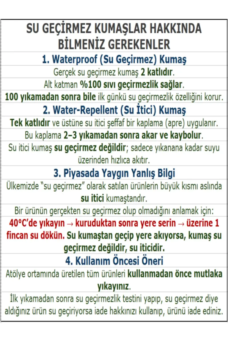 Ürün, akrilik kumaşlardan farklı olarak uzun süreli kullanım için tasarlanmıştır. Akrilik kumaşlar 5-10 yıkamadan sonra sıvı geçirmez özelliğini kaybederken, bu önlük uzun süreli kullanımda bile aynı performansı korur. Önlük satın alırken kumaşın akrilik olup olmadığını kontrol etmenizi öneririz. YORNİ marka önlükler, kaliteli ve sağlıklı malzemelerden üretilmektedir. Çocuğunuzun rahatlığı ve sağlığı bizim için önceliklidir.