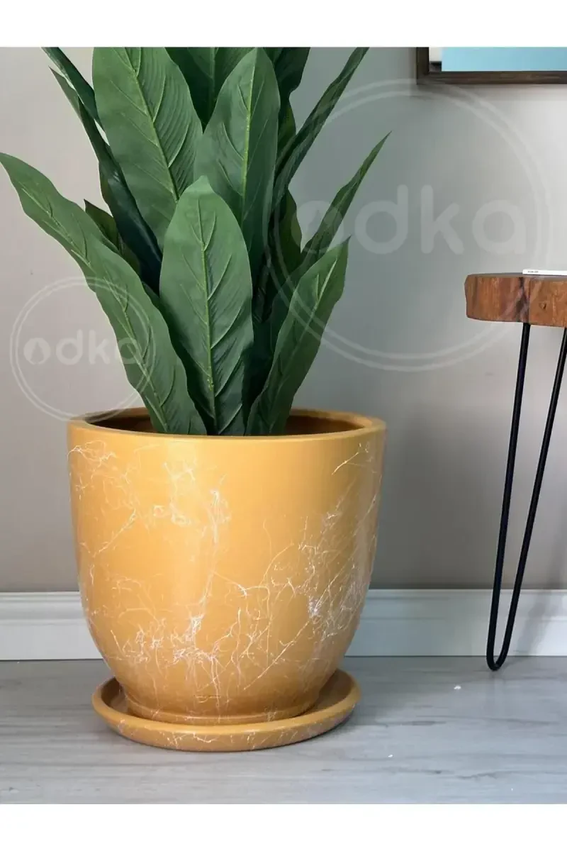 Odkadekor's meticulously designed 10-liter pot offers a stylish home for your plants while adding an aesthetic touch to your living space. This pot, which attracts attention with its yellow marble pattern, combines modern and authentic styles and will be indispensable for your decoration. This pot and saucer set, suitable for both indoor and outdoor use, provides an ideal environment for your plants to grow healthily. The pot, made of terracotta, stands out with its durability and natural structure. Specially designed for those with allergies and odor sensitivities, this pot is painted and varnished with odorless paint that does not contain chemical toxins and is not harmful to human health. In this way, you can use it safely in closed spaces. Thanks to the drainage holes in the pot, water accumulation is prevented when you water your plants, and the growth of bacteria and root rot are prevented. Being handmade ensures that each pot is unique and special. Measurements may rarely vary by +/-1cm, which emphasizes the unique character of each pot. It is also very easy to clean; You can wash it with water or wipe it with a damp cloth without using detergent or wet wipes. Odka pots create a stylish and authentic style in your decoration with their natural appearance offered to your living space. It adapts to every decoration style with different color and pattern options. With this pot, your plants will no longer be just decorative elements, but will become a part of your living space. This pot is an ideal choice for displaying your plants and providing them with a healthy living space. If you want to add a natural and stylish touch to your home, balcony or garden, this pot is for you. Remember, this set does not include plants, so you can choose the plant you want and reflect your own style.
