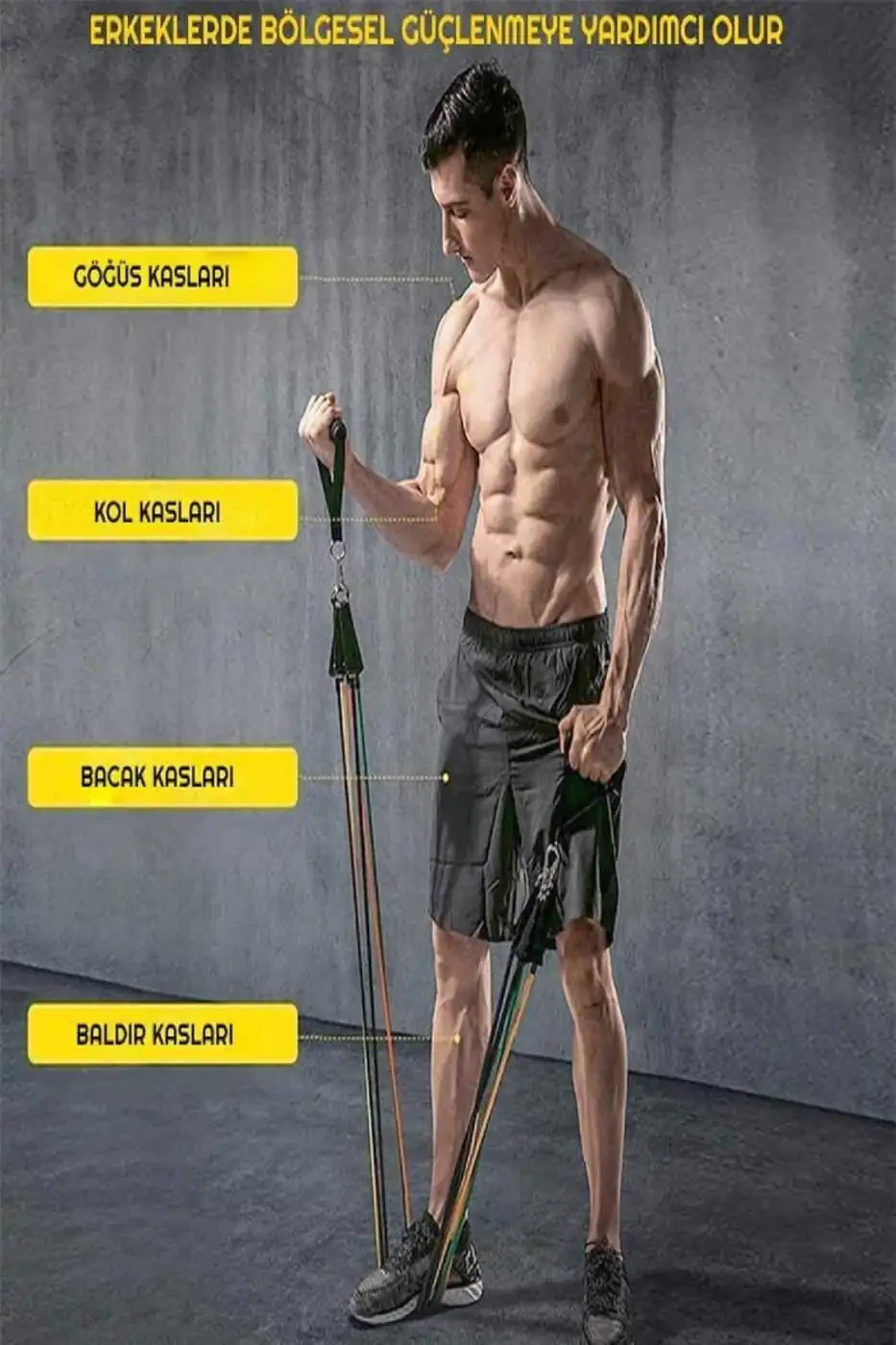 В набор входят 5 цветных резиновых лент разной степени сопротивления, 2 ручки, 2 петли для ног и 1 крепление для двери. Это предлагает подходящий вариант для людей с любым уровнем физической подготовки.