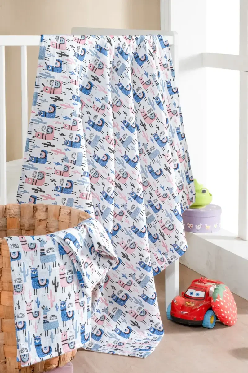 The 100% Cotton 2-Piece Muslin Baby Blanket Set, carefully designed for your little baby's delicate skin, combines comfort and versatility. This special set offers a natural and healthy environment that you can safely use from the first months of your baby's life. Thanks to the unique texture of muslin fabric, your baby's skin breathes comfortably, while its soft touch provides a peaceful sleep experience. These 100x100 cm blankets are designed to meet the different needs of your baby's growth process. Whether you use it as a swaddle, a nursing cover, a stroller cover, or a play mat, these multi-purpose blankets are an indispensable helper that will be with you at all times. The breathable structure of muslin fabric prevents your baby from sweating and keeps them at an ideal temperature. In this way, it maximizes your baby's comfort, especially in hot weather. The fact that it is produced from OEKO-TEX certified fabrics guarantees that our products do not contain carcinogenic and toxic substances. Your baby's health is our top priority, and therefore, we only use the safest and most natural materials in our products. Thanks to its hypoallergenic properties, it is also suitable for babies with sensitive skin and minimizes the risk of allergic reactions. These cute llama-patterned blankets add joy to your baby's room while offering a stylish and modern look. These blankets, which become softer after each wash, offer long-lasting use. The fact that it is made of double-layer muslin fabric increases the durability of the blankets and ensures that they remain like the first day for a long time. The fact that the place of production is Turkey shows that we support domestic production and that we produce in accordance with high quality standards. With the importance we give to your baby's health and comfort, you can use this 100% Cotton 2-Piece Muslin Baby Blanket Set with peace of mind. By following the washing instructions, you can extend the life of the product and maintain its softness like the first day. It is recommended to wash at 30 degrees and not to tumble dry. In this way, the structure of the fabric is preserved and the colors remain vibrant. Prioritize your baby's comfort and health with the 100% Cotton 2-Piece Muslin Baby Blanket Set, without sacrificing its elegance.
