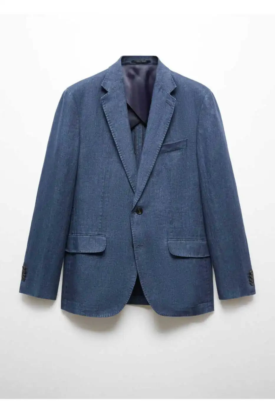 Complete your classic style with this sophisticated 100% Herringbone Linen Blazer Jacket. Its tailored slim fit and premium linen fabric will flatter your body and provide a modern look. Intricate details include embossed notched lapels, a breast welt pocket, two front flap pockets, long sleeves with buttoned tab cuffs, and a fully lined interior with two interior welt pockets. As part of our suit collection, it features a double back vent and front button closure for a timeless look. The slightly tailored Slim Fit design fits closer to your body than a Regular Fit, creating a flattering silhouette that enhances your natural lines for a sharp and contemporary appearance. Pair it with a sweater or T-shirt for a more casual look, or with a classic shirt and tie for special occasions, this blazer jacket is versatile enough to complement any style. Made with 100% linen and quality lining, it ensures durability and comfortable wear. Follow the care instructions to enjoy your jacket for many years to come.