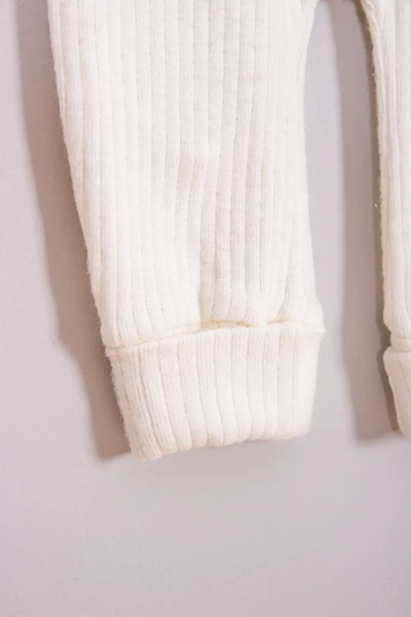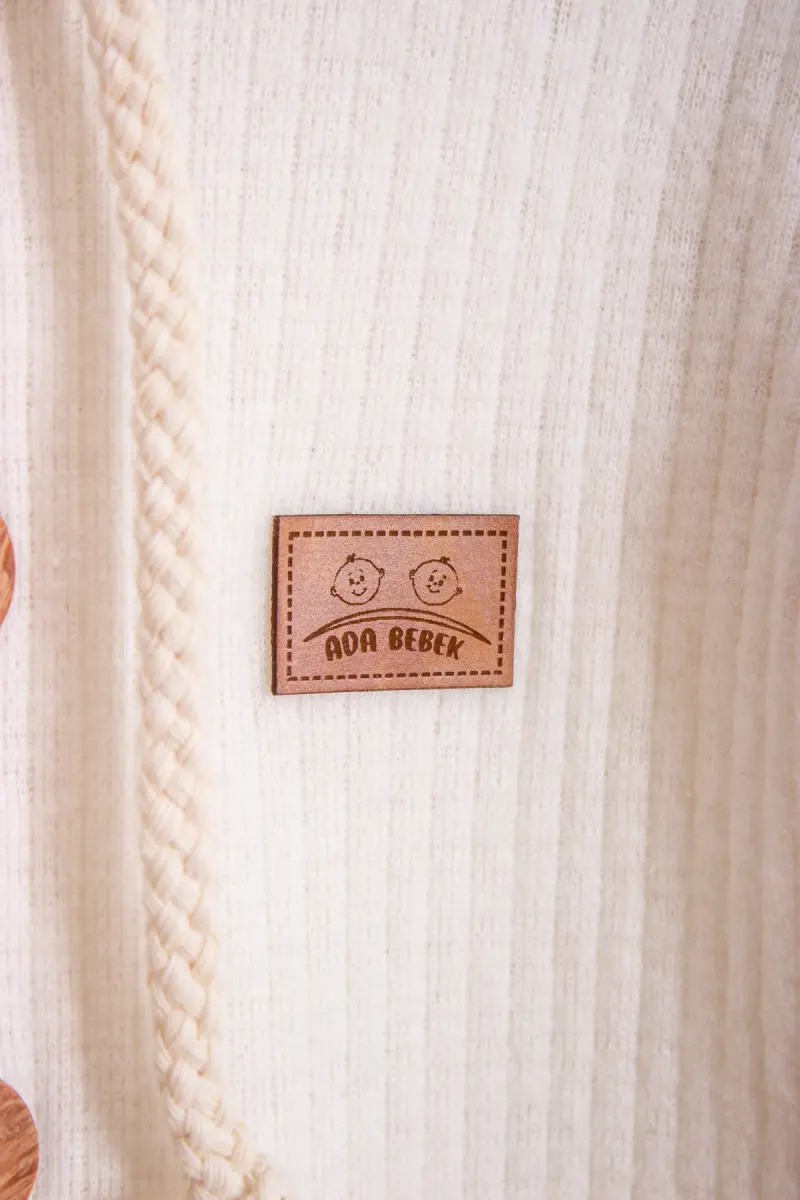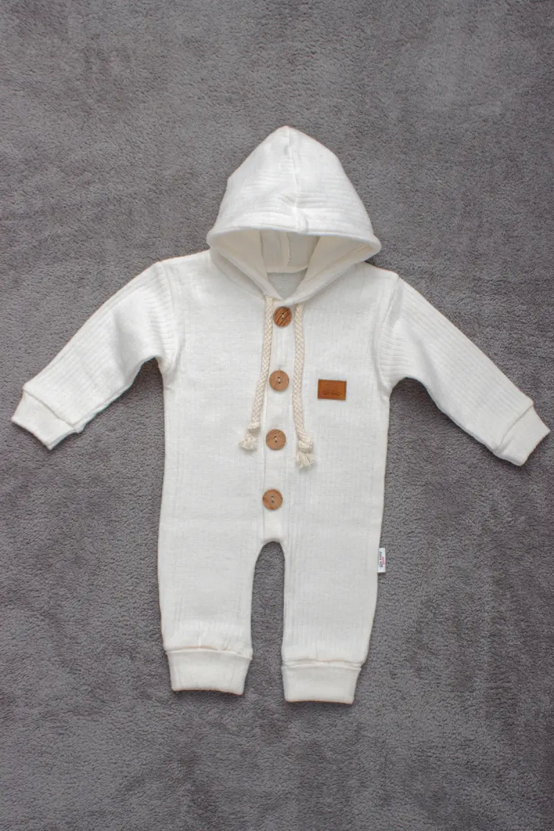 %100 Pamuk Ahşap Düğmeli Kapşonlu Fitilli Tarz Şapkalı Bebek Tulum-KREM