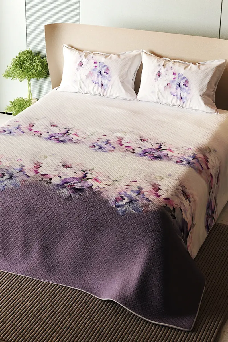 %100 Pamuk Çift Kişilik Pike Takımı Yatak Örtüsü Özel Dokuma Lila Çiçekleri-Lila