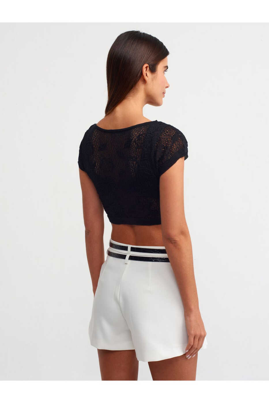Блузка из трикотажа с лодочкой и коротким рукавом 10553 с цветочным кружевом - это вещь, которую вы можете с комфортом носить в любое время повседневной жизни. Вы можете создать стильный повседневный образ, сочетая ее с джинсами, или же достичь роскошного стиля, сочетая ее с юбками для ваших особых дней.