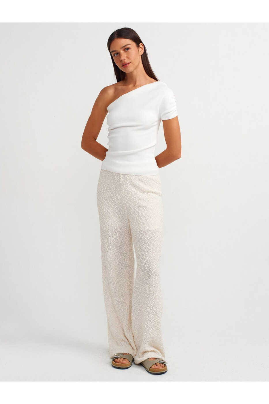 10597 Assimetrik Drapelangan Triko Ko'ylak - Ekru - Nafis va Qulay