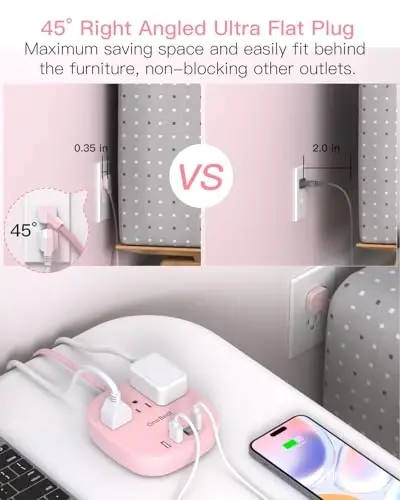 Say goodbye to cable clutter and space issues with the 10Ft Flat Plug Power Strip, Pink Flat Extension Cord! This stylish and practical product is designed to meet the needs of modern life. Whether you are at home, in the office, in a dorm room, or even on a cruise, this product is ready to accompany you. Its ultra-thin plug design and 10 ft long braided cable make it easy to access outlets while allowing you to make the most efficient use of your space. Thanks to its 0.35-inch ultra-thin plug, which is much thinner than traditional plugs, and its 45-degree angled design, it can be placed close to walls and easily hidden behind furniture. This prevents outlet and space wastage. The 3mm thick braided extension cable is made of pure copper and has a better current carrying capacity (15A). The braided power cord does not deform easily, is durable and safer. The 7-in-1 desktop power strip converts a single outlet into 3 outlets, 2 USB-A ports, and 2 USB-C ports, allowing you to charge up to 7 devices simultaneously. You can use it for your mobile phone, laptop, tablet, headphones, or cameras without the need for various converters. It keeps your desktop tidy and is a must-have accessory for dorm rooms, homes, offices, bedrooms, kitchens, etc. that you share with your colleagues. The 2 USB-C ports added for Apple device users can provide charging up to 5V/3A. The 2 USB-A ports can charge up to 5V/2.4A Max. The total output of all USB ports is 5V/4.5A, 22.5W max, which means 30% faster charging than other 15W power strips. Specially designed for cruises, this small power strip does not have surge protection, making it a must-have accessory for use on cruises. This is because power strips used on cruises should not have surge protection. Its compact and lightweight design makes it easy to carry and ideal for travel. Made with high-quality components and 1382℉ flame retardant material, this power strip protects your electrical devices against overcurrent, overcharging, short circuits, and overheating. It is ETL and FCC certified.
