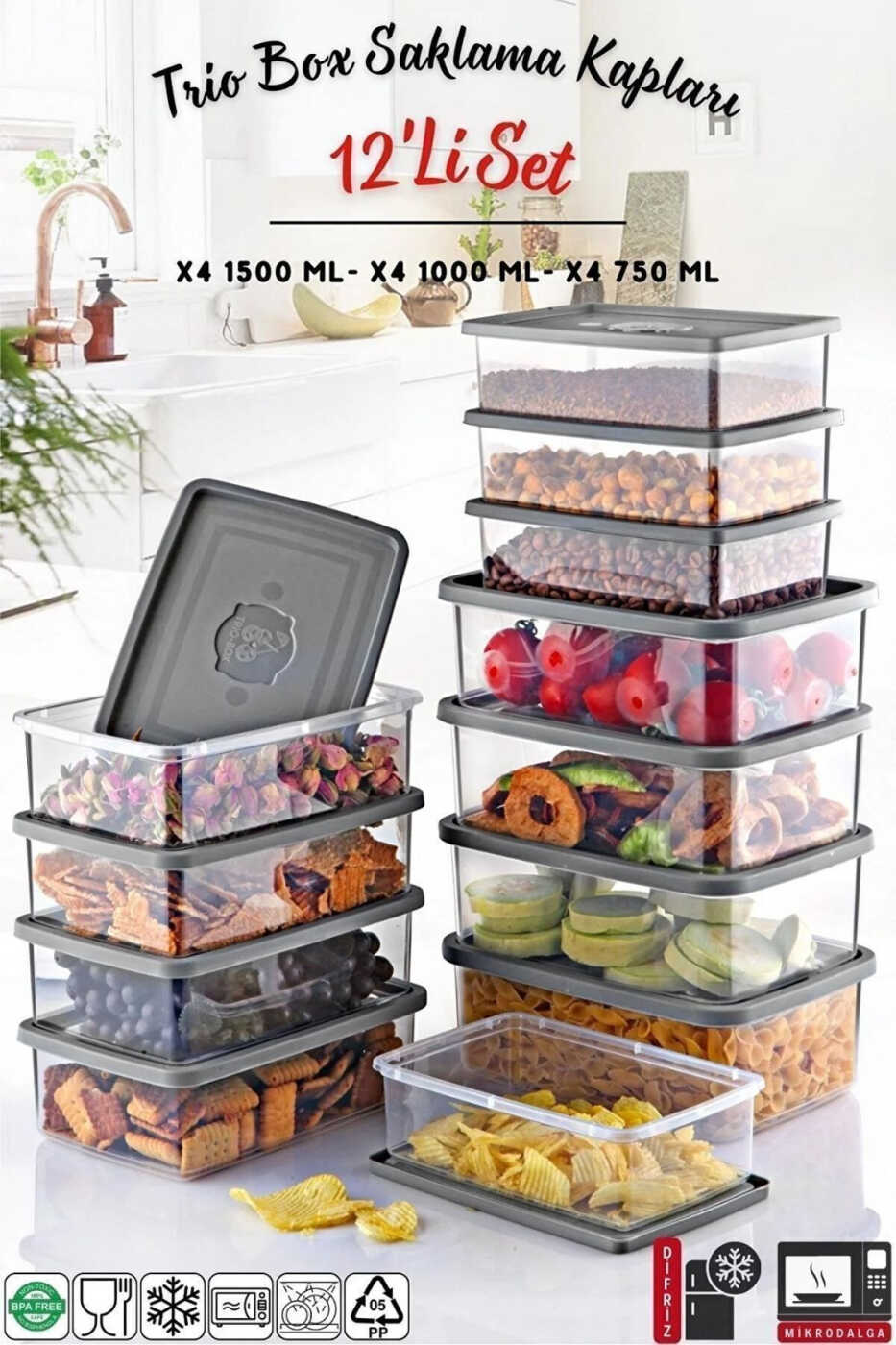 12'Li Set Dikdörtgen Mikrodalga & Difriz Uyumlu Trio Saklama Kabı X4 0,75 Lt/1 Lt/1,5 Lt