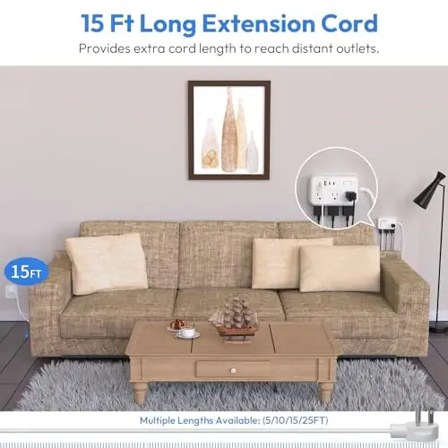 15 Feet Uzatma Kablosu, 6 Geniş Priz ve 4 USB Portlu Dalgalanma Koruyucu Priz ile elektrik ihtiyaçlarınızı kolaylaştırın. Düz fiş tasarımı, dar alanlarda bile rahat kullanım sağlar ve duvar montajı özelliği ile istediğiniz yere kolayca monte edebilirsiniz. 1080 Joule dalgalanma koruma özelliği ile cihazlarınızı voltaj dalgalanmalarından koruyarak güvenli bir kullanım deneyimi sunar.