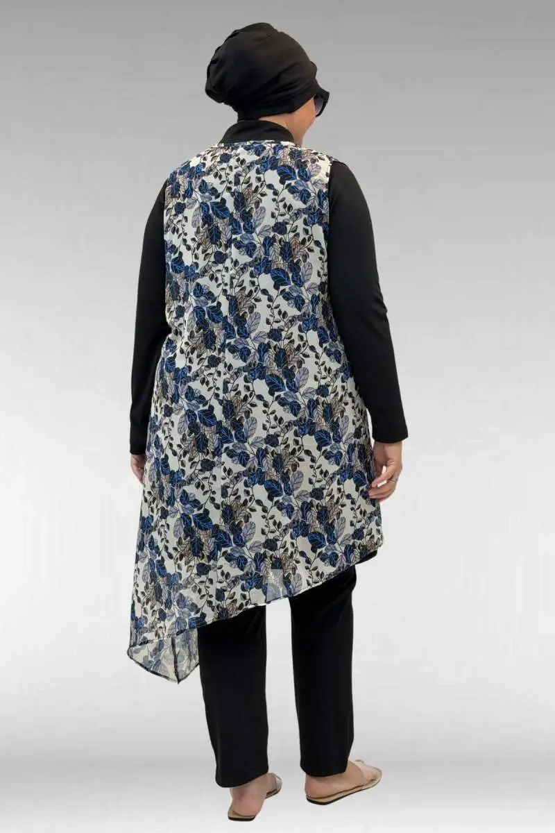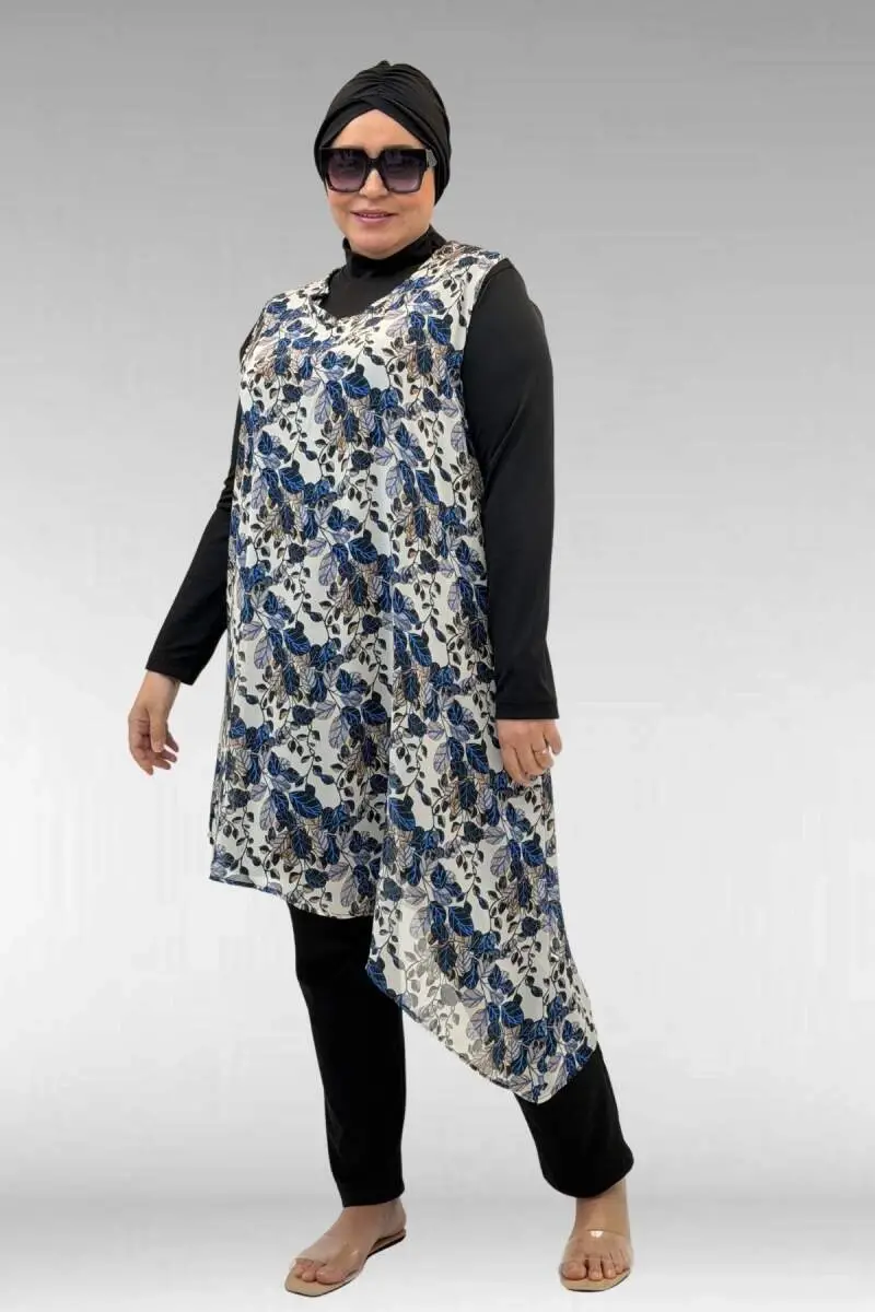 1723 Büyük Beden Uzunkol Şifon Pareolu Tesettür Mayo - Yaprak Desen Mavi