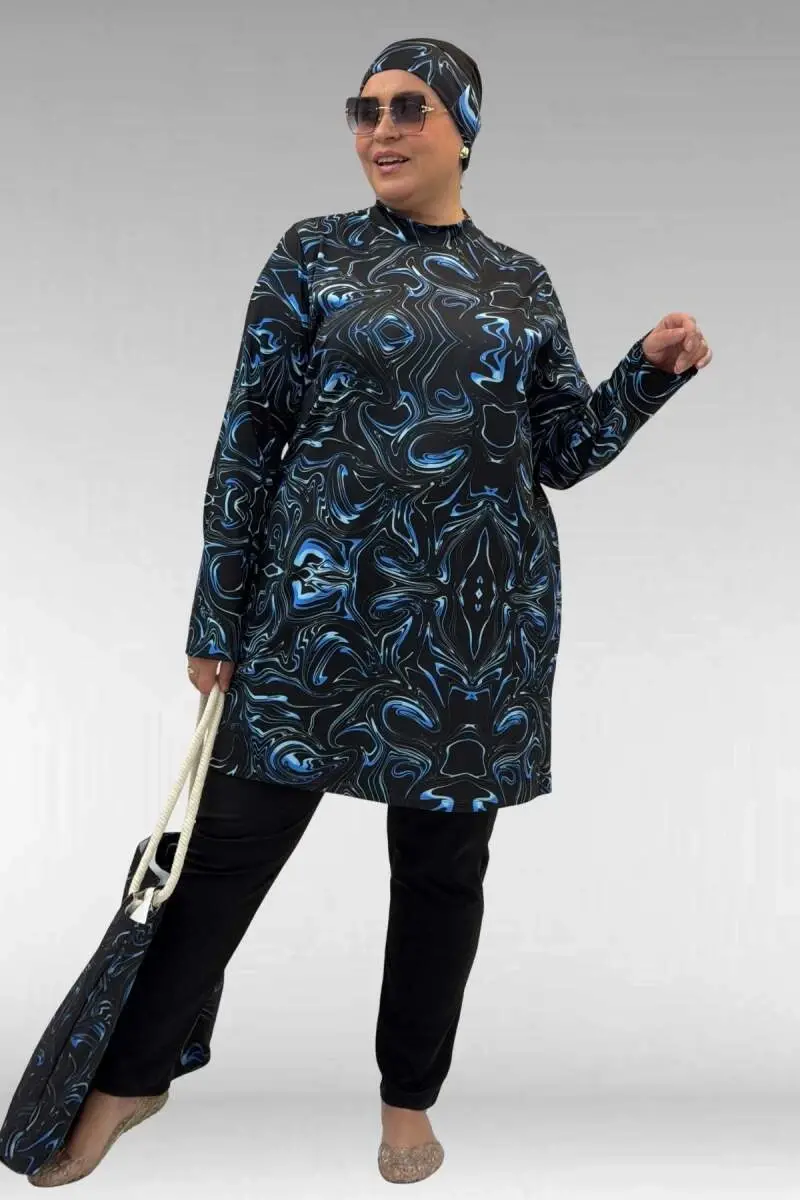 1727 Büyük Beden Uzunkol Tesettür Mayo Takım - Aqua Mavi-Siyah