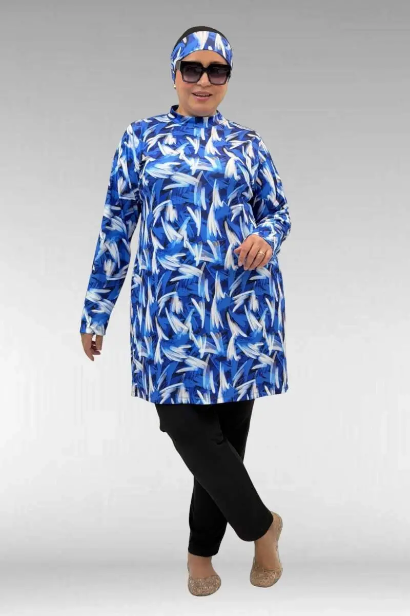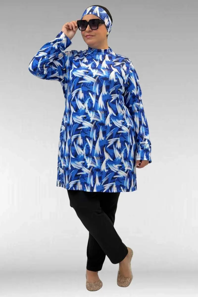RENK: Karışık Desen MaviKALIP: 3XLKUMAŞ: Taktel Mayo Kumaşı (%95 Polyester-%5 Likra)MEVSİM: Yaz*Dahil parçalar üst tunik, pantolon, bone mevcuttur.Mankenimizin ÖlçüleriBEL GENİŞLİĞİ: 88cmGÖĞÜS GENİŞLİĞİ: 103 cm. BASEN: 116 cm. BOY: 1,70 cm. TOPUKLU BOY: 1,75 cm.