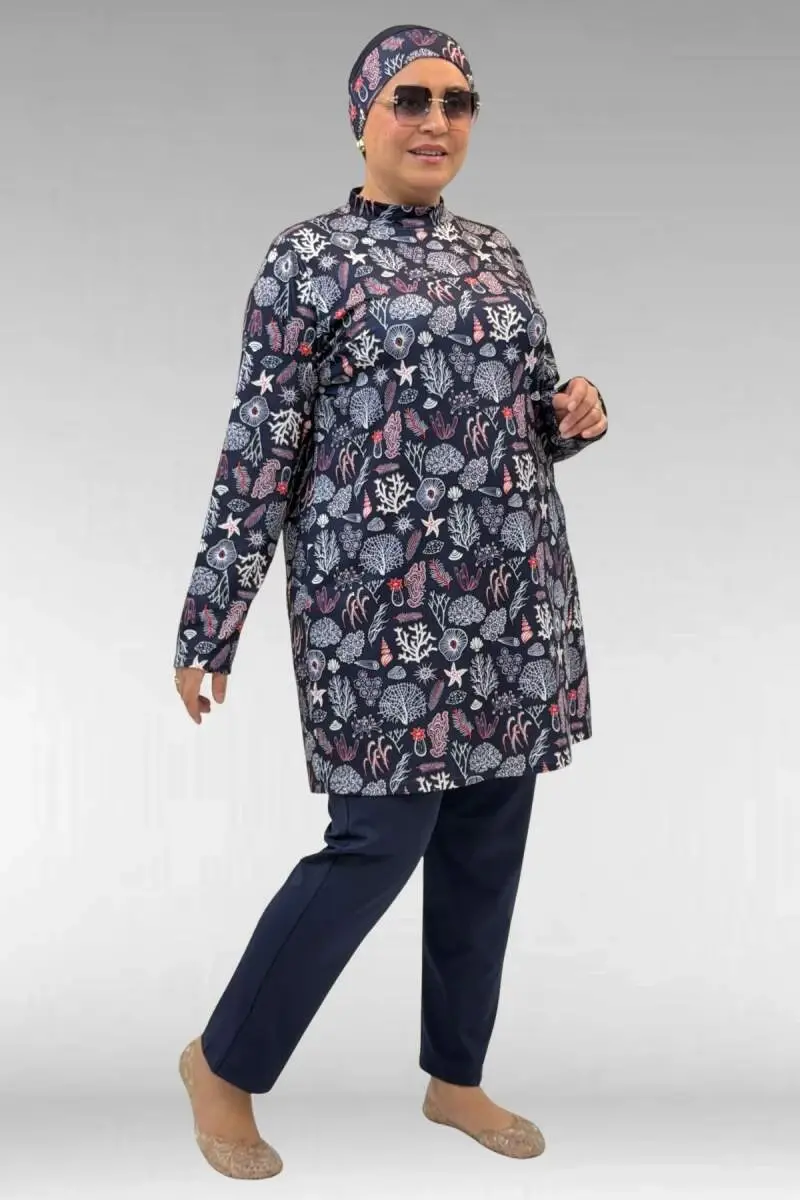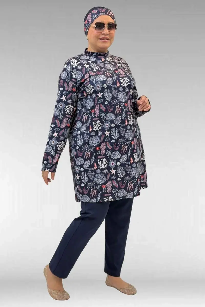 1727 Büyük Beden Uzunkol Tesettür Mayo Takım - Karışık Desen Laci-Laci