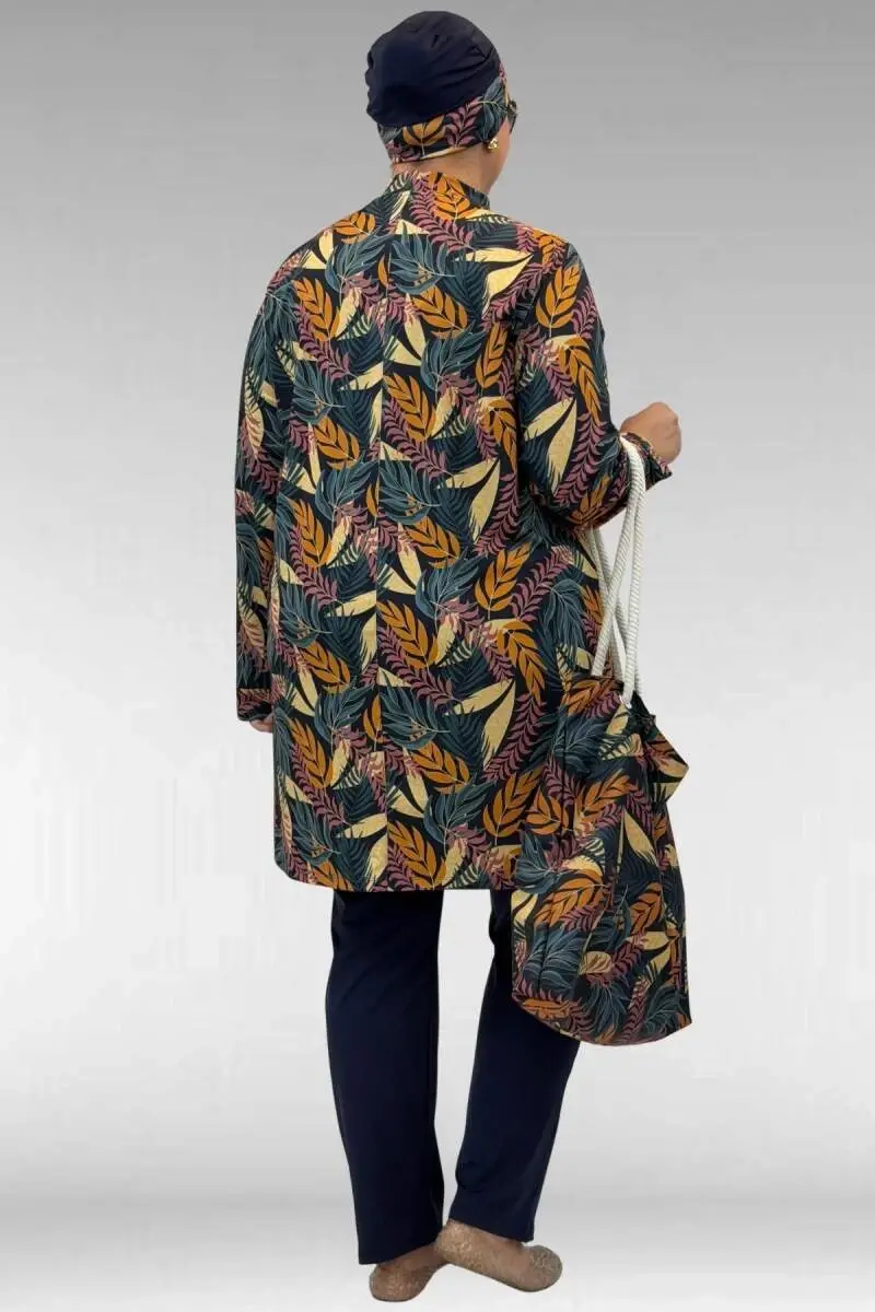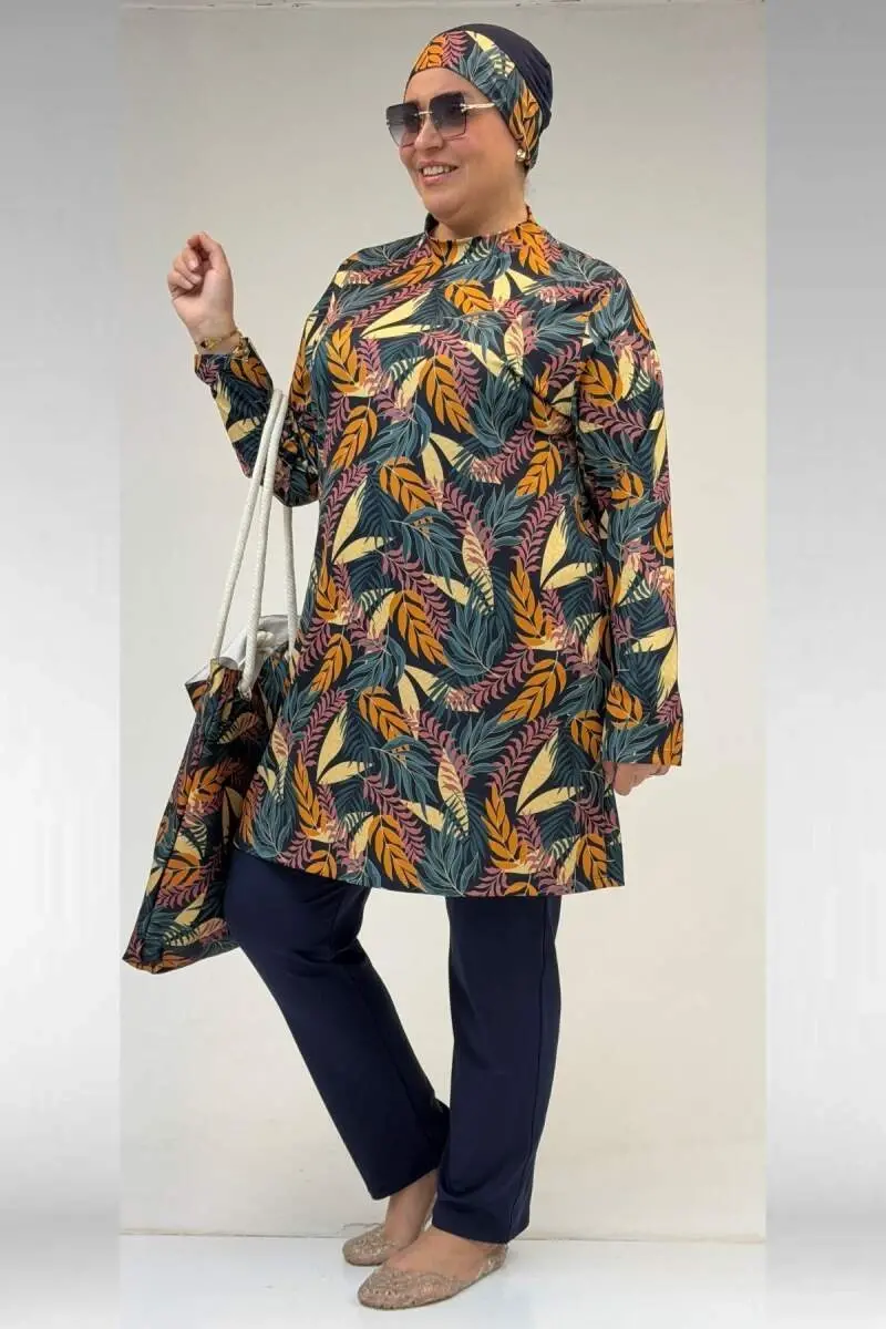 1727 Büyük Beden Uzunkol Tesettür Mayo Takım - Yaprak Desen Hardal-Laci