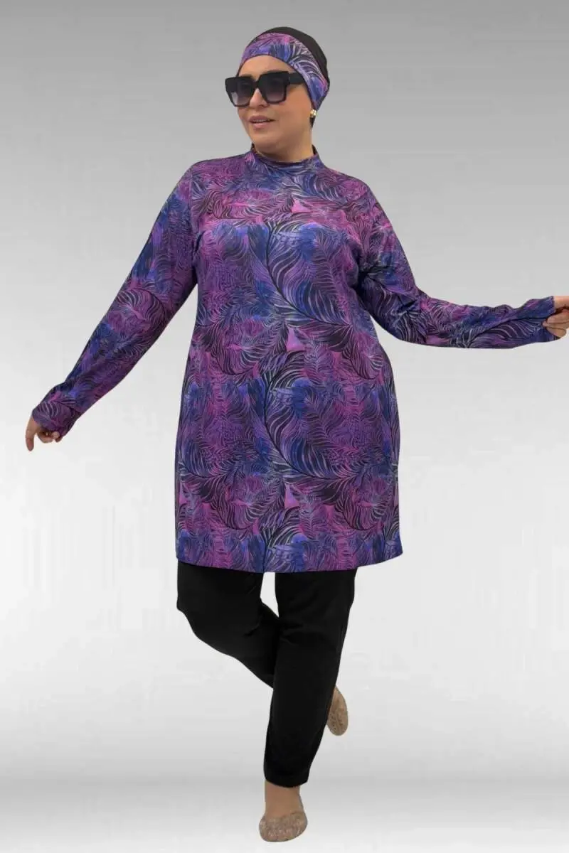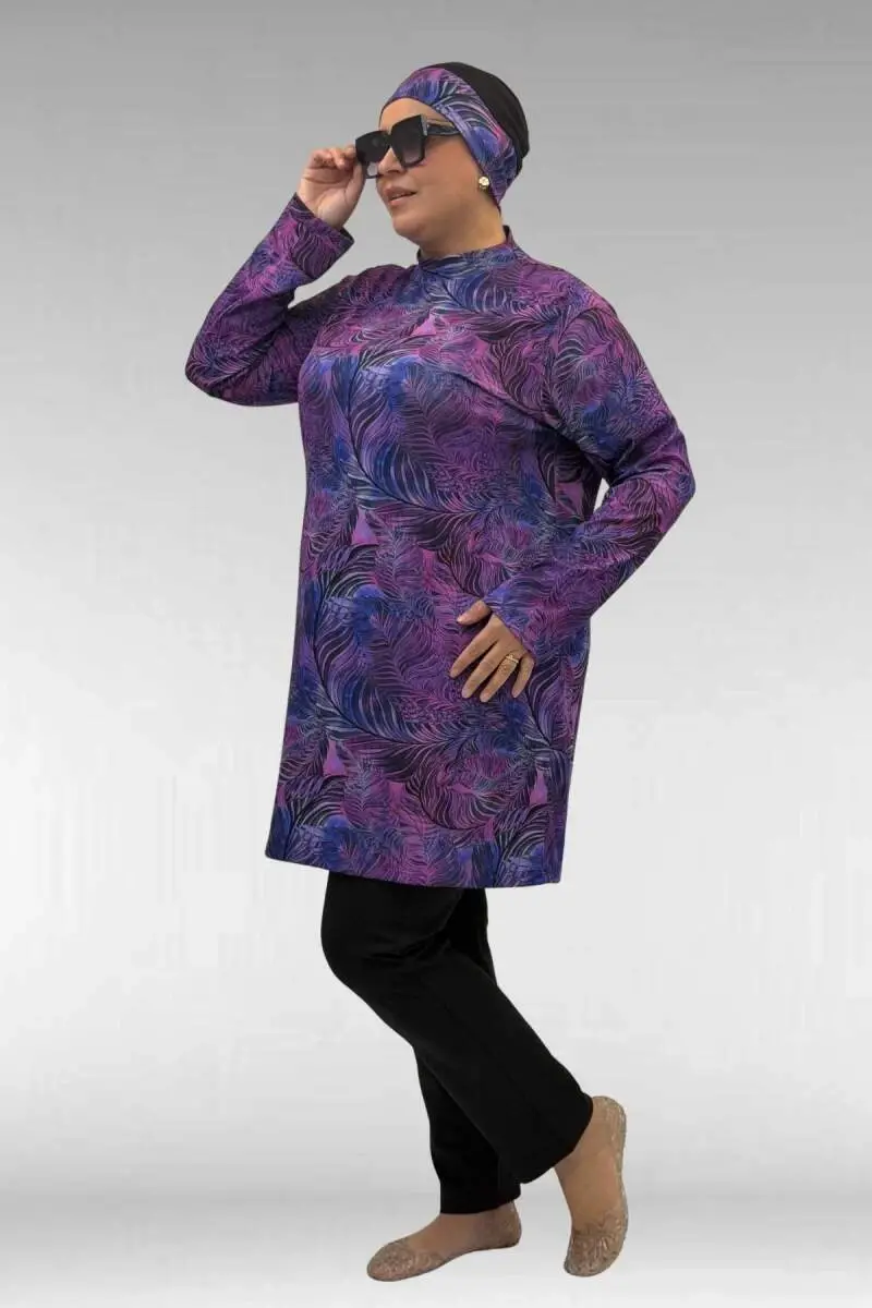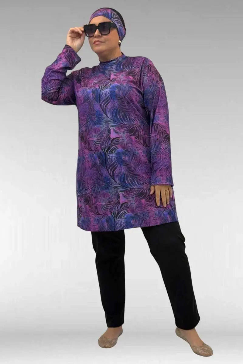 1727 Büyük Beden Uzunkol Tesettür Mayo Takım - Yaprak Desen Mor-Siyah