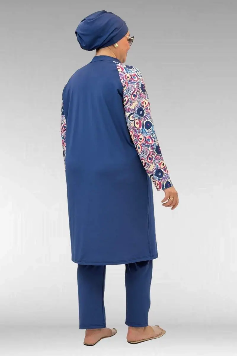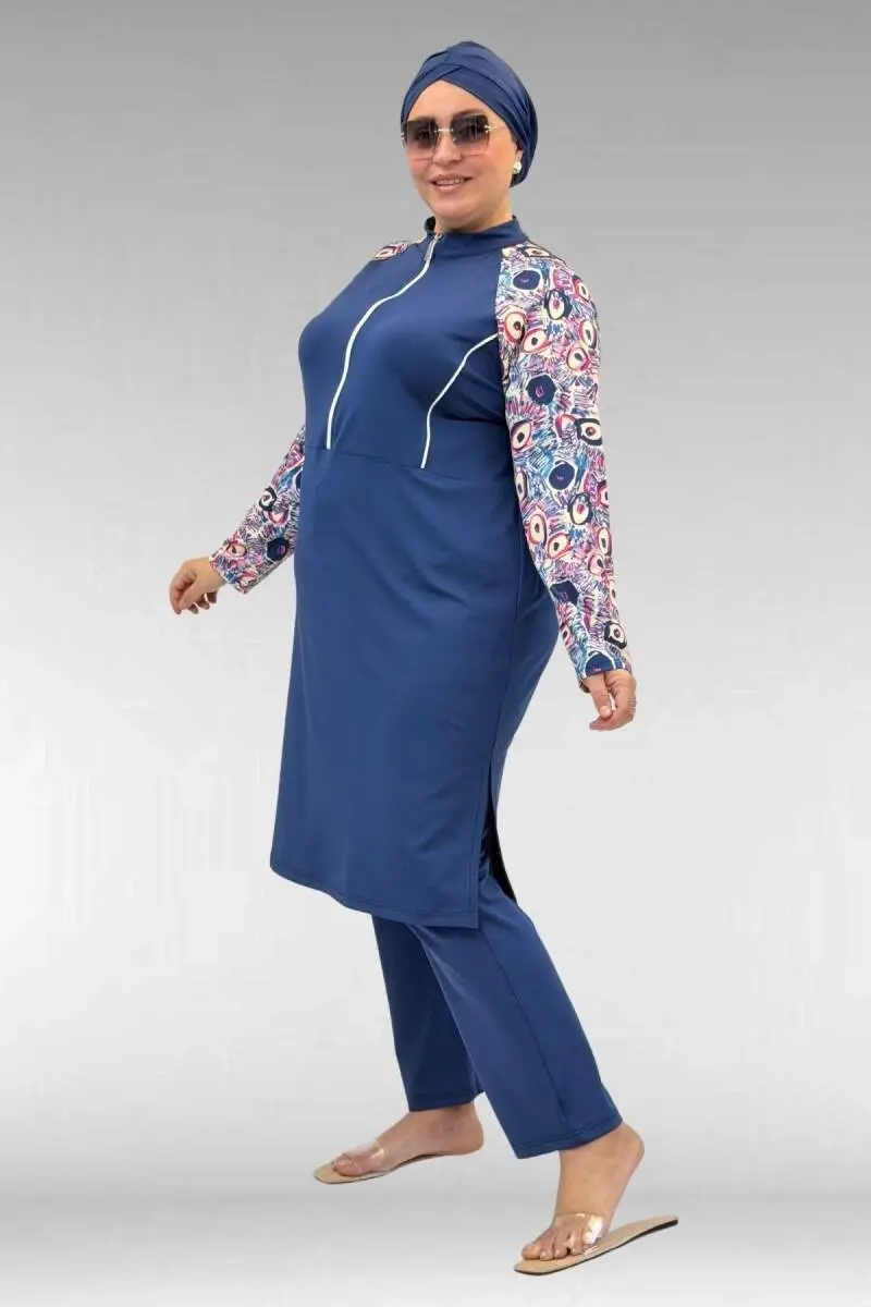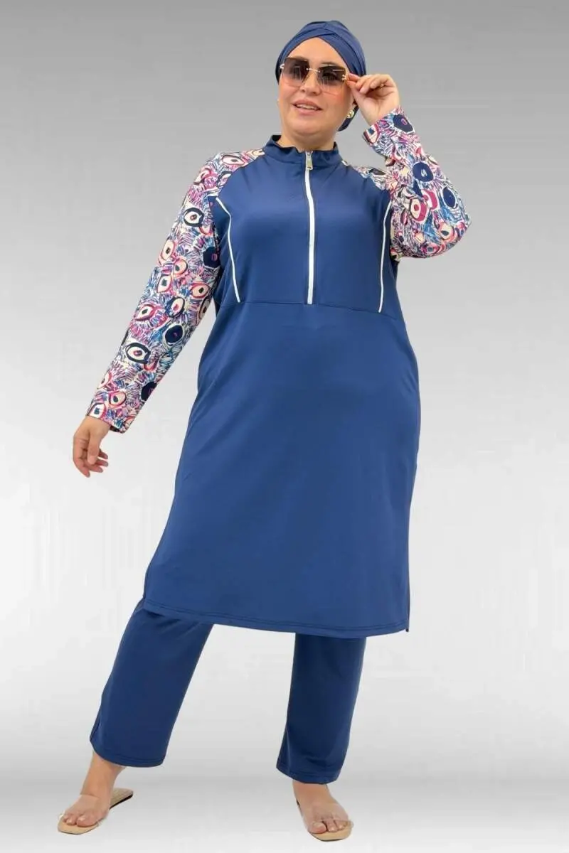 1733 Büyük Beden Fermuarlı Tesettür Mayo - Göz Desen İndigo-İndigo