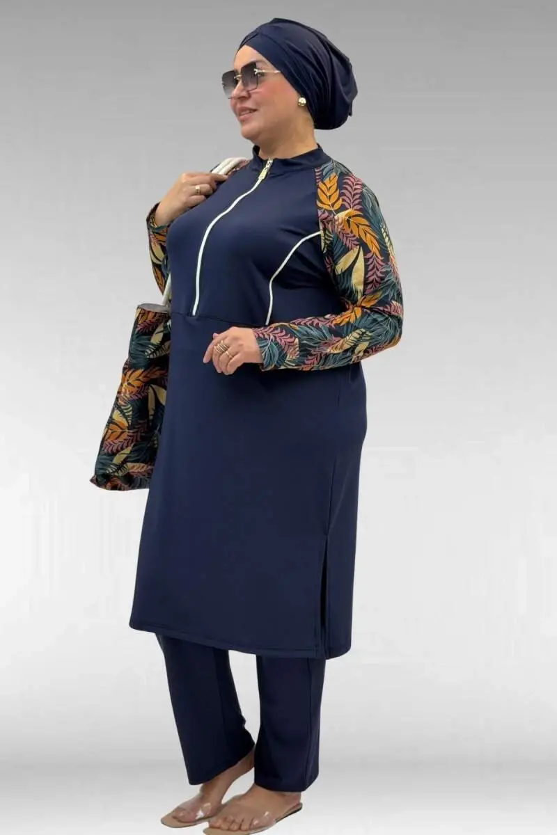 Combining the joy of sea and pool, which is indispensable for summer holidays, with elegance and comfort, the 1733 Plus Size Zippered Hijab Swimsuit is specially designed for women who adopt the hijab clothing style. Drawing attention with its elegant leaf patterns and the eye-catching harmony of mustard and navy blue, this swimsuit allows you to reflect your style in beach fashion. The high-quality Tactel swimsuit fabric used in its design gently hugs your body thanks to its flexible structure and does not restrict your freedom of movement. Specially prepared by considering the needs of plus-size users, the 3XL fit offers a comfortable use all day long. The zippered top tunic design provides both ease of putting on and taking off, and adds a modern aesthetic look. Thanks to its water-resistant structure and quick-drying feature, you will feel much more comfortable shortly after getting out of the sea. The fabric technology, which is resistant to chlorine and sunlight, helps the product's colors maintain their vibrancy as the first day for a long time. The matching trousers and bonnet included in the set complete your combination perfectly. Prepared for confident women who want to enjoy the beach without compromising their elegance, this model offers you a unique experience both while relaxing by the pool and swimming. An ideal choice for those looking for quality and comfort hidden in the details, the 1733 model hijab swimsuit is a candidate to be the most favorite piece of your summer wardrobe. Whether you are on holiday with your family or friends, you can both impress with its modern lines and enjoy moving freely with its fit that perfectly adapts to your body structure.
