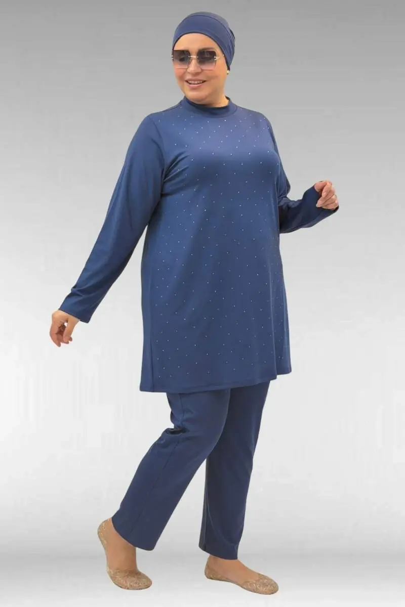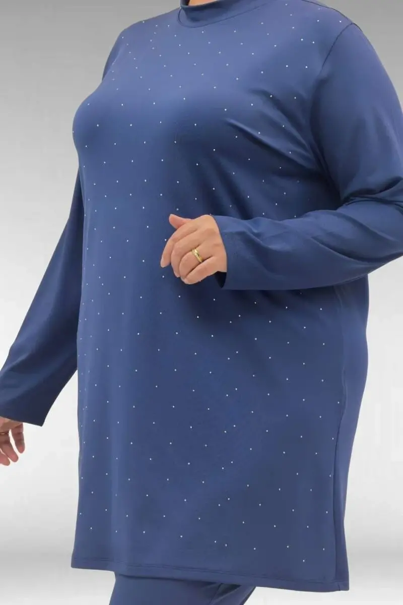 1739 Büyük Beden Önü Taş Baskılı Uzunkol Tesettür Mayo - İndigo