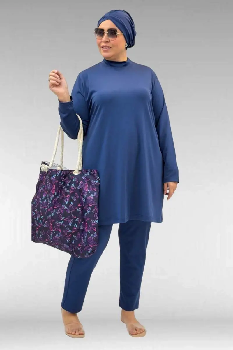 1740 Büyük Beden Düz Renk Tesettür Mayo - İndigo