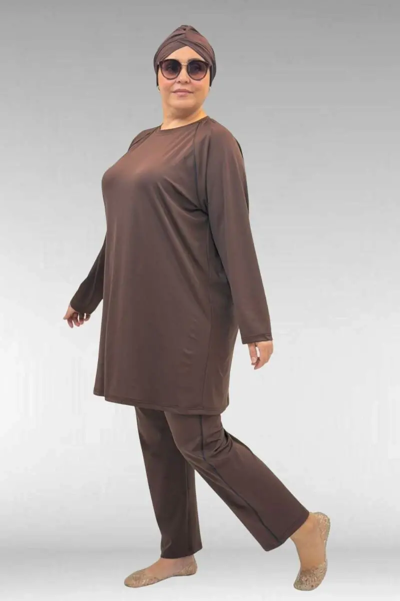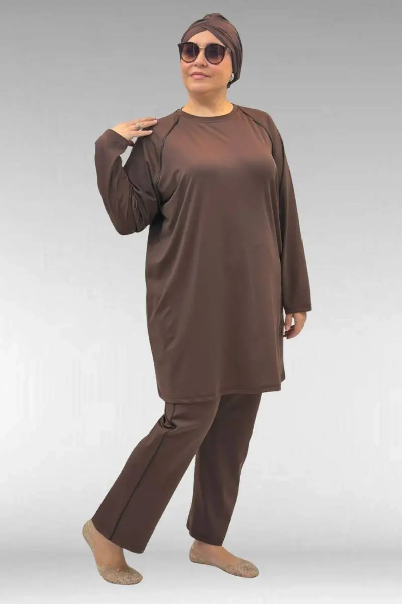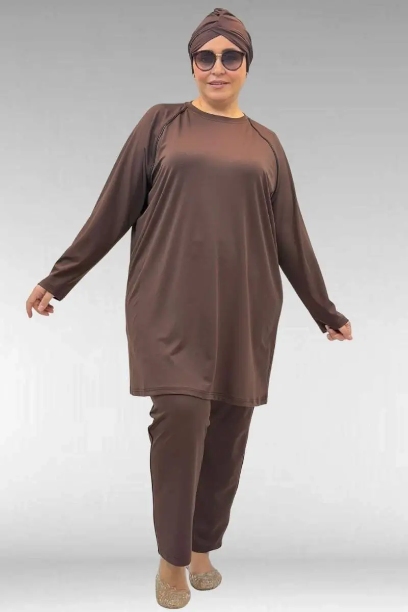 1741 Büyük Beden Kıstırma Biyeli Tesettür Mayo - Kahve