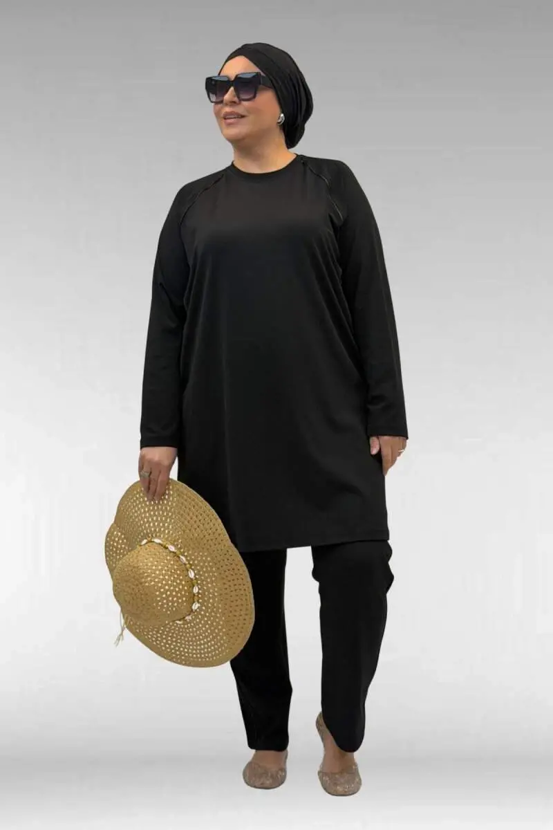 1741 Büyük Beden Kıstırma Biyeli Tesettür Mayo - Siyah