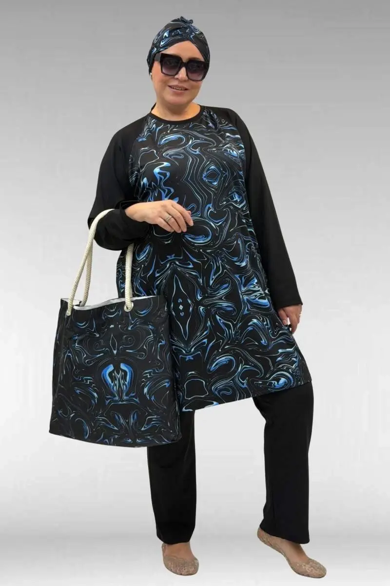 1742 Büyük Beden Uzunkol Tesettür Mayo Takım - Aqua Mavi