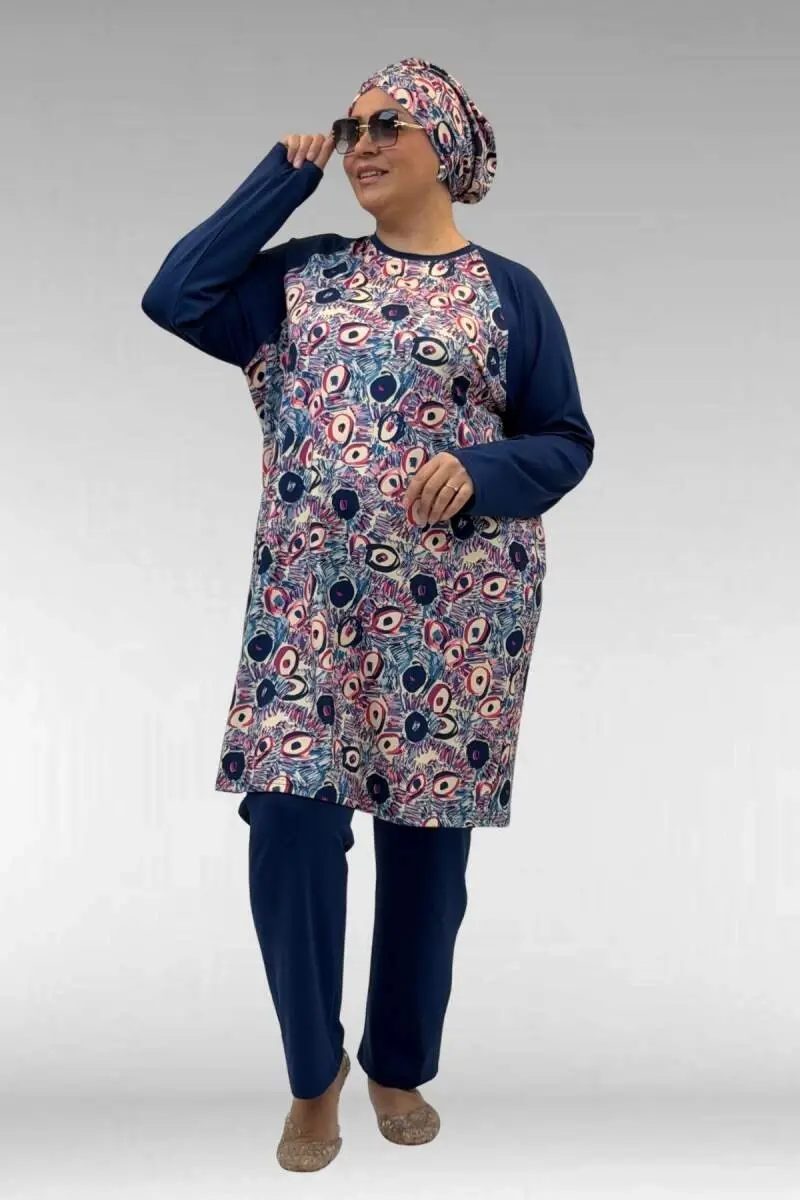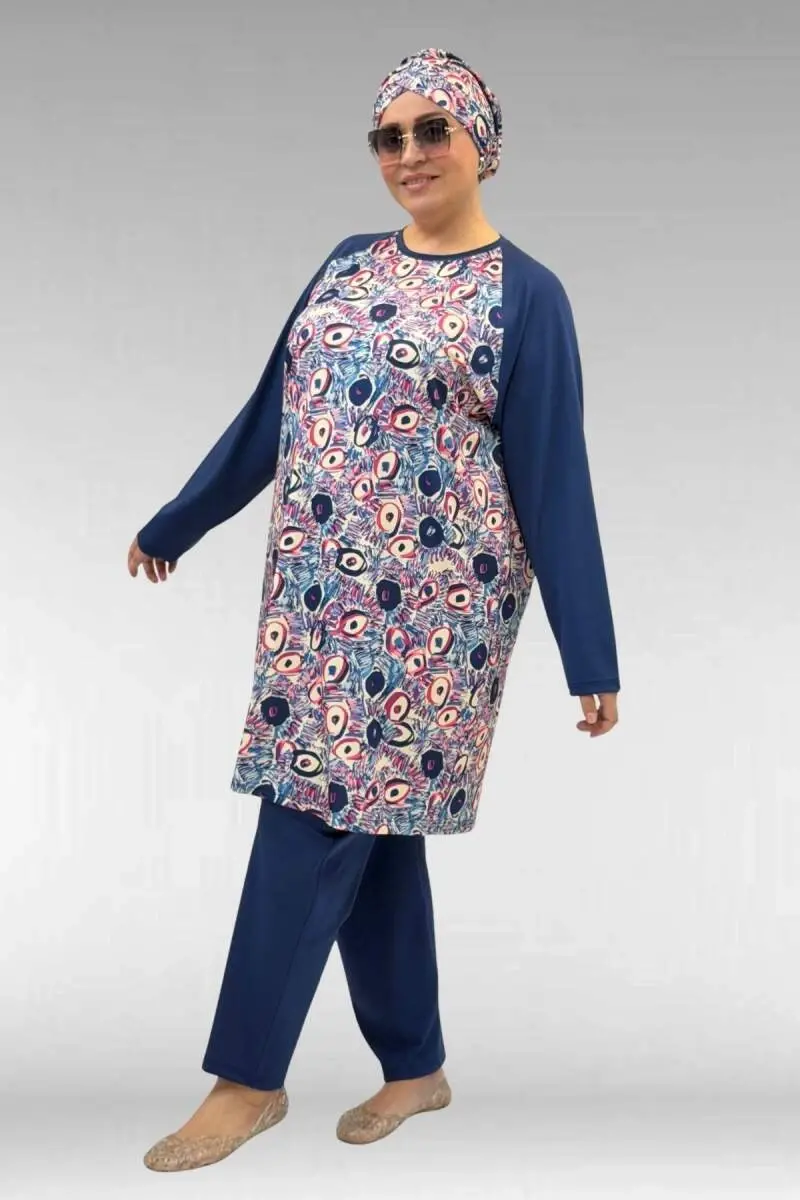 1742 Büyük Beden Uzunkol Tesettür Mayo Takım - Göz Desen İndigo
