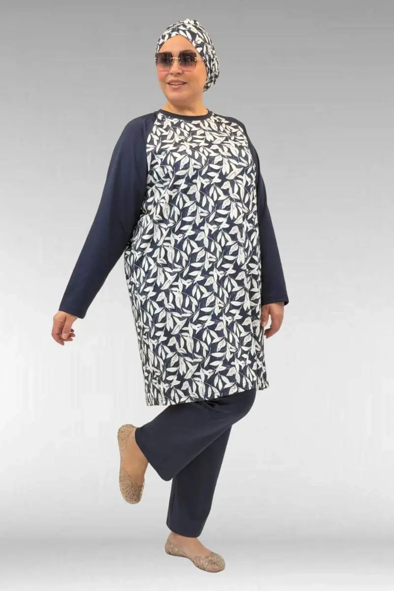 1742 Büyük Beden Uzunkol Tesettür Mayo Takım - Yaprak Desen Ekru