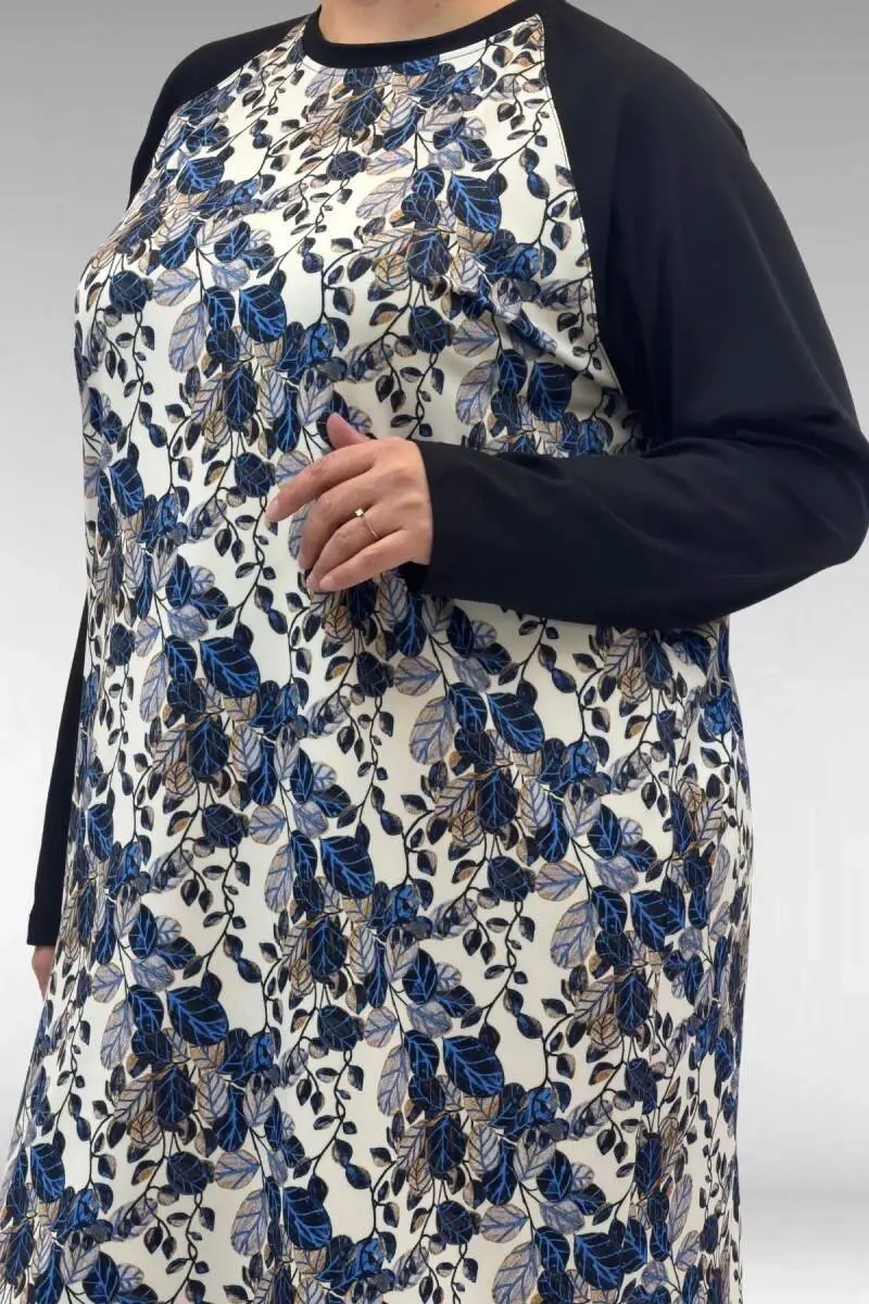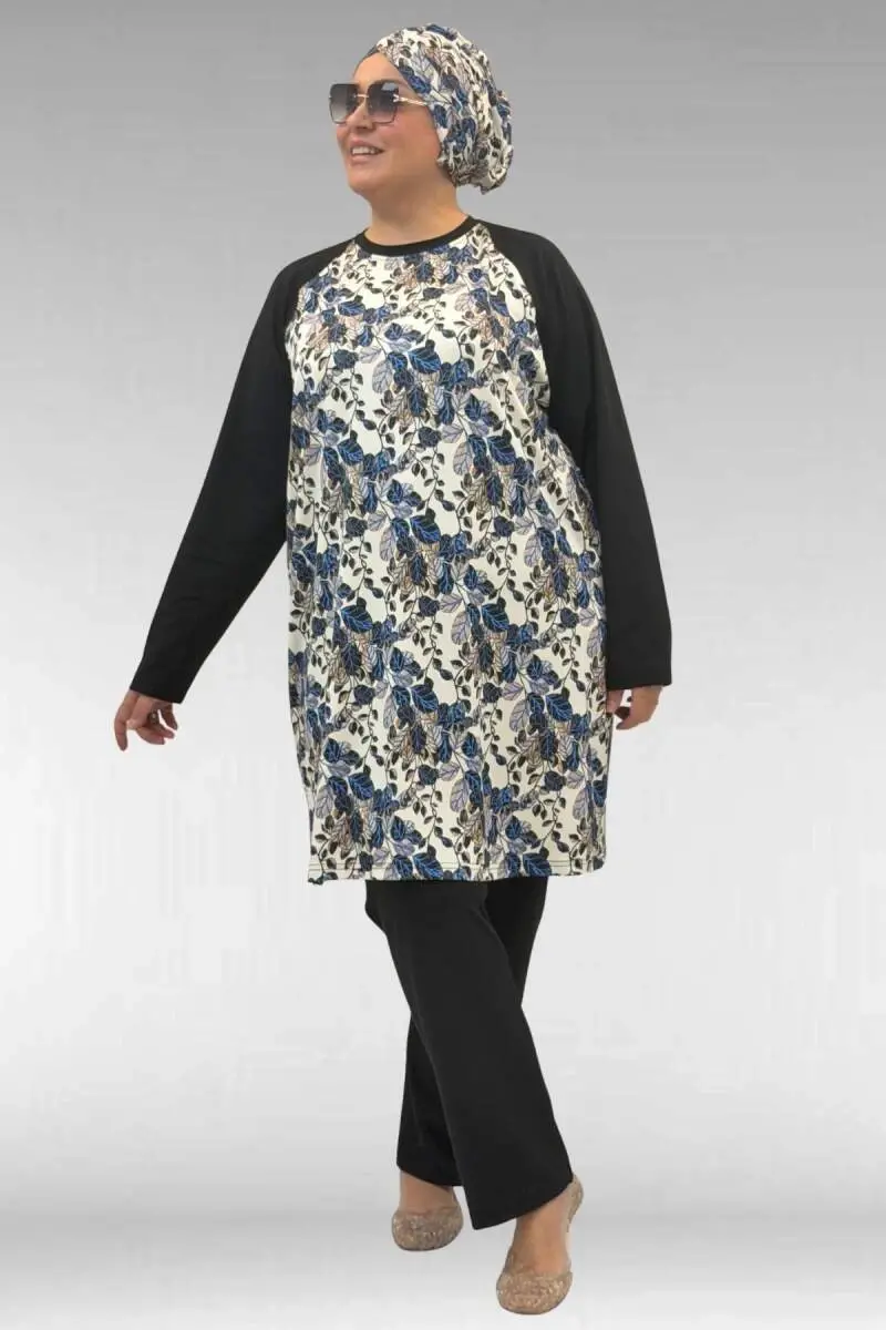 1742 Büyük Beden Uzunkol Tesettür Mayo Takım - Yaprak Desen Mavi