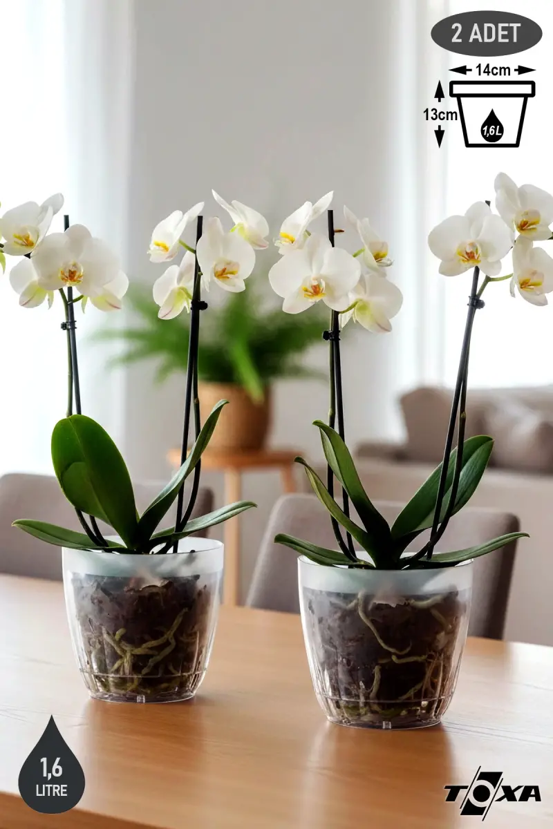 2 Adet 1,6 Litre Kristal Orkide Saksısı Set Tabaklı Şeffaf Plastik Saksı Seti-1,6L Set