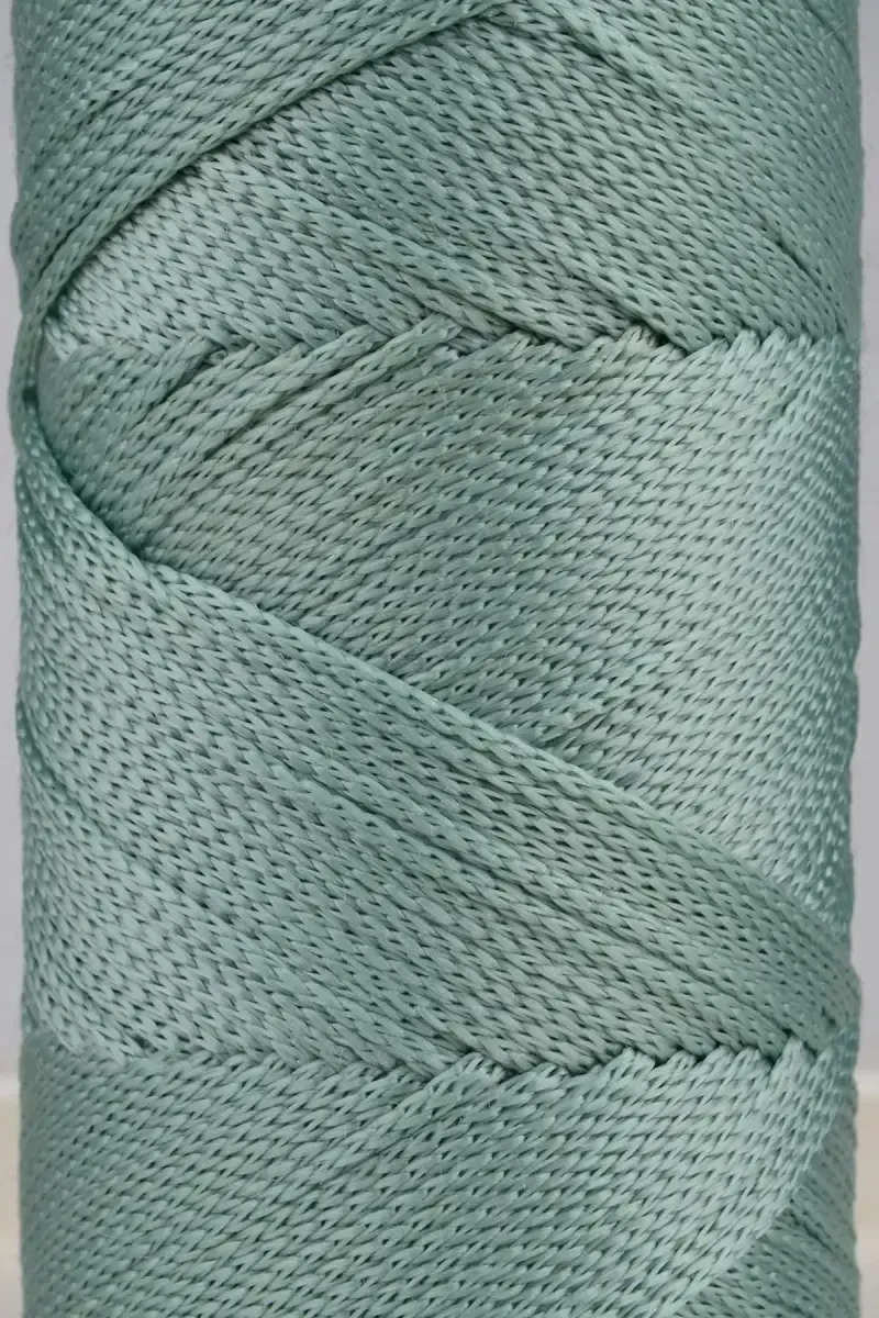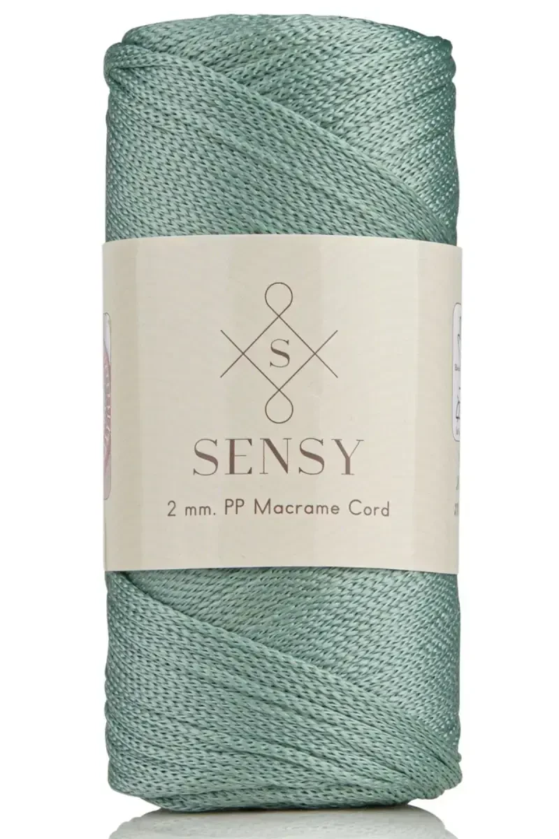 2 mm thick, 200 grams in weight, approximately 230 meters long polyester macrame rope. Ideal for placemats, bags, and various macrame projects. It is sage green in color.