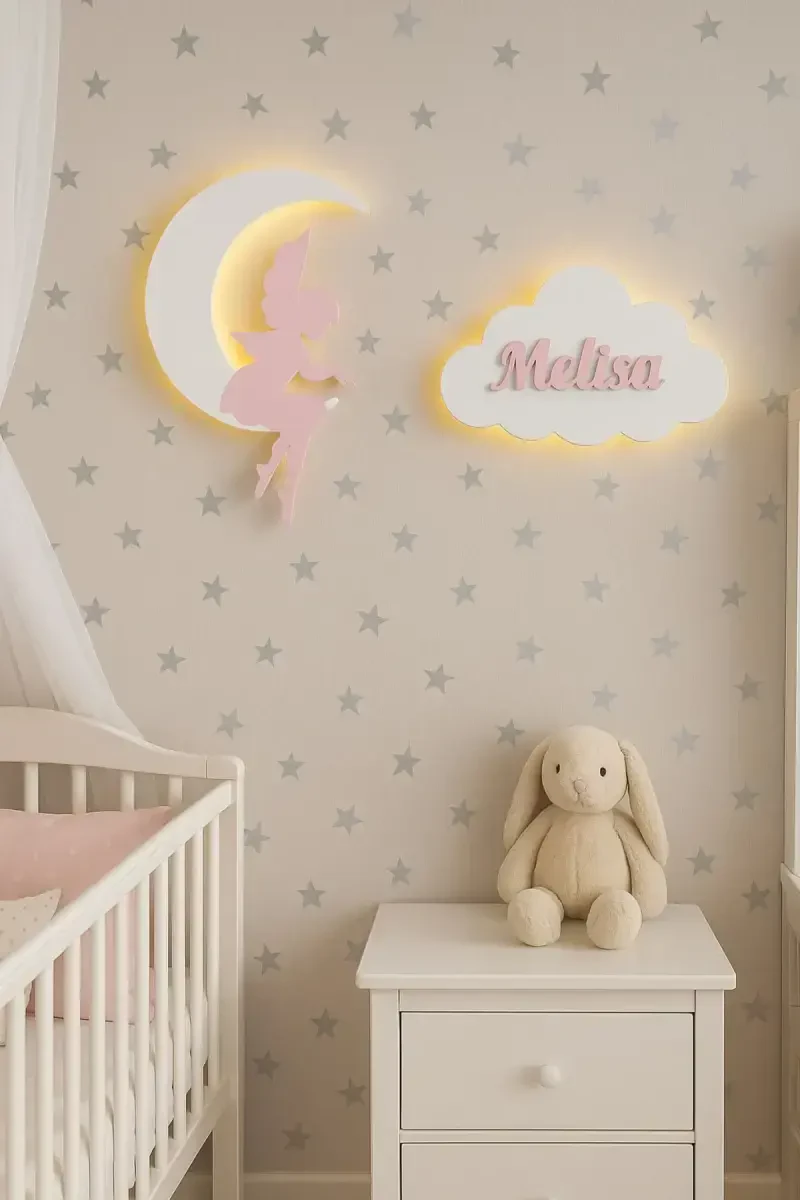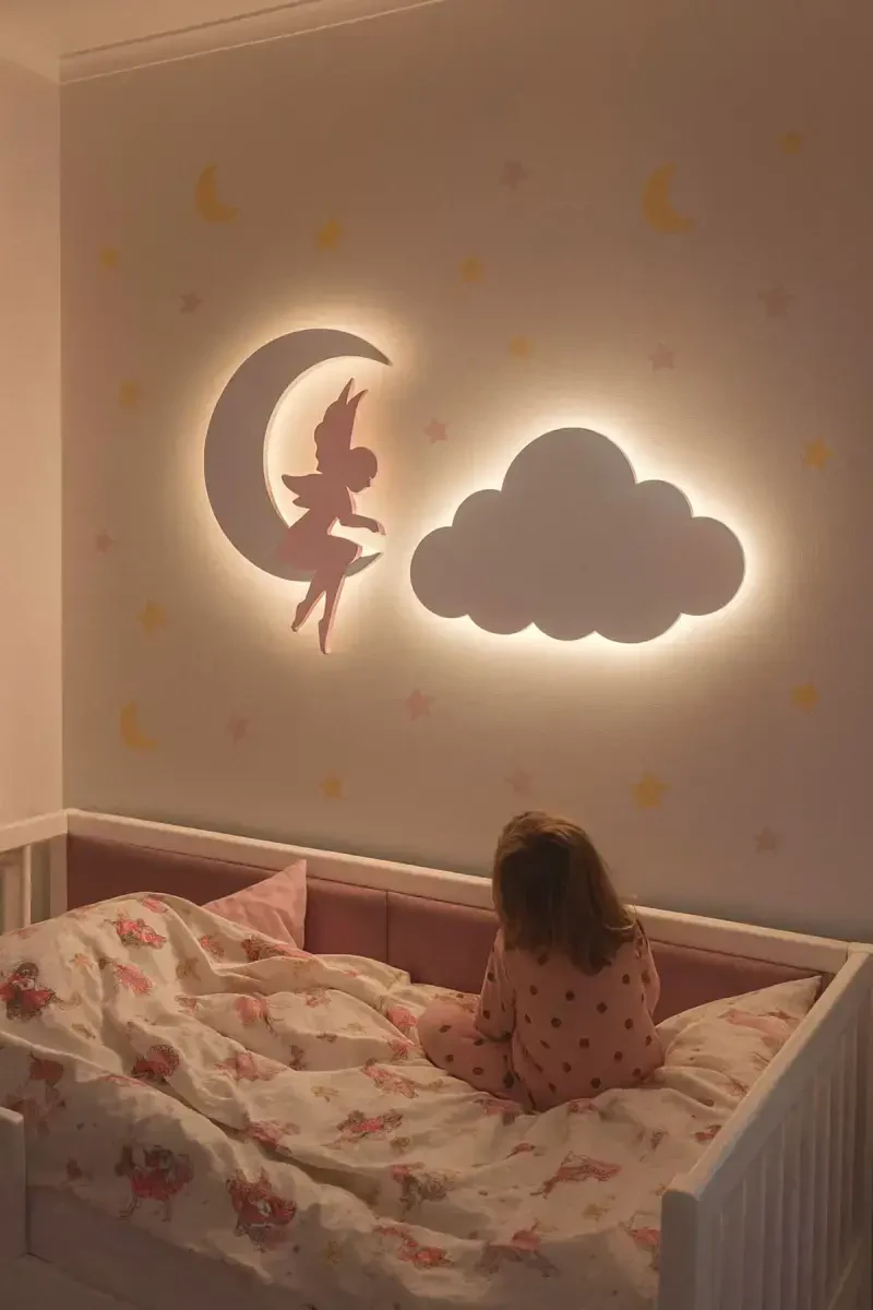The 2-Piece Wall Decoration Fairy Girl Moon and Named Cloud Night Light is a perfect choice to transform baby and children's rooms into a magical fairytale world, nurturing your child's imagination and helping them fall asleep peacefully at night.