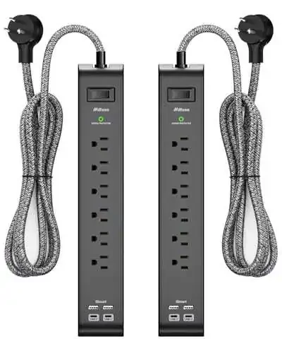 2-х пакетный сетевой фильтр с защитой от перенапряжения с 6 розетками, 2 портами USB, 5-футовым тяжелым плетеным удлинителем, плоской вилкой, 900 джоулями, 15A автоматическим выключателем, настенным креплением для дома и офиса, с сертификатом ETL
