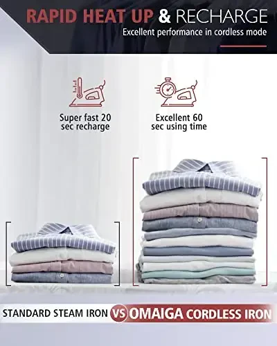 Discover the freedom of ironing with the OMAIGA [2023 UPGRADE] Cordless Iron! Thanks to its cordless design, you can get rid of the clutter caused by cables while ironing. With its 1500W power, this iron offers fast and effective performance, making your housework easier. The OMAIGA Cordless Iron, which attracts attention with its advanced features, will completely change your ironing experience. With the comfort of cordless ironing, you can iron your clothes perfectly and save time. Thanks to its unique 360-degree rotating charging base and LED lights, you can easily place and remove the iron and enjoy full cordless control. Thanks to its powerful performance, the ceramic soleplate heats up quickly and is ready for reuse in less than 25 seconds. This feature minimizes waiting time while ironing, allowing you to use your time more efficiently. The OMAIGA steam cordless iron easily removes even the most stubborn wrinkles with its 130g steam and 80g/min steam burst feature. It provides continuous steam output for up to 60 seconds, softening the wrinkles on your clothes and allowing you to achieve a freshly ironed look. Now ironing your clothes is much easier and more enjoyable. Designed for fast and efficient ironing, this cordless iron glides smoothly and delicately on all fabric types thanks to its ceramic soleplate and pointed tip. This feature reduces ironing time by up to 30% while allowing you to iron delicate fabrics without damaging them. The steam iron has 3 different temperature settings that provide the ideal temperature for different fabric types. In this way, you can safely iron your clothes by choosing the most suitable temperature for each fabric type. The 300ml large water tank capacity allows you to iron the entire laundry basket with a single filling. The self-clean function and anti-limescale function protect the performance of the cordless iron by cleaning the limescale. When the temperature of the iron is insufficient to create steam, the automatic shut-off system cuts off the water flow, preventing dripping from the soleplate and providing extra safety. Save time while ironing with the OMAIGA Cordless Iron and ensure that your clothes look perfect. With its stylish design and user-friendly features, this iron will be an indispensable part of your home. Remember, every cordless iron is subjected to a functional test before being put on the market. Therefore, it is normal for there to be some water residue in its tank. If you have any questions about the product, please do not hesitate to contact us. With a one-year warranty, you can use the OMAIGA Cordless Iron with confidence.
