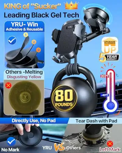 [Millions of Drivers Choose YRU] Thanks to 200+ material tested, 250 models optimized, and 60000Miles+ bumpy road tests, the YRU R&D team designed the upgraded windshield/dashboard car phone mount. The convinced structure was certified by RoHS, CP65, and REACH. [Leading Upgrades-Approved by 6,500,000+ Drivers] [1]Most Reliable-Aviation material “PTFE” works well in -40°F~203°F harsh scenes. [2]Most Stable-Air capsule silicone inside the clamps protects the phone all around.[3] 50X sturdy & steel-cored vent clip always grip car vent. [Patented 80LB+ Load Suction Cup, Super Powerful] YRU Heavy Duty window/Dash Phone Holder Mount for car truck uses the German Merck Tech Suction Cup with patented glue and structure. Adhesion is over 80 LBS (better than ever)which withstands the temperature range (-40℉ to 203℉). [Large/Heavy Duty Phone &Thick Case Friendly, Humanized Multi-Function Design] The 0.78" adjustable foot and clamps that fit 4-7" large phone with thick case, Like for iPhone 11/12/13/14/15/16 Pro/ Pro Max, for Galaxy S22 23 24/S21 etc.YRU offers a sticky suction cup & steel-cored vent clip which work on car vent/dashboard/windshield. Apply to cars/trucks/SUVs/taxis. [Exclusive Enlarged Button Design, Easy Clamp] YRU designed the Industry-leading easy clamp car phone stand which has won 2 patents in EUIPO and passed the 6,000hours test to achieve quick clamping & release. [Latest Launched Cord Clip, Tidy & Safe] Listen to the voice of customers, YRU launched a cord clip to keep your car away from clutter, ensuring the cord stays connected. [Infinite Viewing Angle, Never Block View ] The YRU car cell phone holder has a flexible 360°ball-joint rotation.The telescopic arm could be pivoted up and down 270 and extended from 5.52" to 8.86". Never block your view while driving. [4 IN 1 Mount & High Notch Configuration] A good choice for driving navigation, listening to music, making phone calls, etc. Package includes 1 x Suction Cup, 1 x Phone Bracket, 1 x Air Vent Clip, 1 x Cable Clip, 2 x Cleaning Cloths, 1 x User Manual. ATTENTION: 1.If your car dashboard material is Leather (except faux and synthetic leather)/waxed/oiled, TEXTURED or CURVED, Please use the mount on the windshield/air vent instead. 2. In the extreme summer heat, high temperature may affect the suction, it is recommended to install the suction cup away from the direct sunlight [Width of Clamp Arm]: 2.6"-4.6"; [Depth of Phone Cradle]: 0.8"(Thick case and large cell phone compatibility); [Diameter of Suction Cup]: 2.68"(Flat & Smooth dashboard without any gap or crack to install the suction cup.)