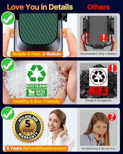 2026 𝗡𝗲𝘄𝗲𝘀𝘁 Best Car Phone Holder - bu avtomobil telefon ushlagichlari texnologiyasining cho'qqisidir. Ushbu mahsulot shunchaki telefon ushlagichidan ko'proq narsani taklif etadi va haydash tajribangizni har tomonlama yaxshilashga qaratilgan. Beshta turli xil foydalanish usuli (old oyna, old panel, shamollatish, ish stoli va kabelni boshqarish) bilan u bozordagi eng mos va ko'p qirrali echimlardan biridir. Patentlangan dizayni, 0,8 dyuymli qisqich qo'li va 360° aylanadigan asosi tufayli u iPhone 16, S24 Ultra kabi katta ekranli qurilmalar hamda qurilmalarning 99,9% bilan mos keladi. Ikkita tugmachali bo'shatish mexanizmi bitta tugmachali raqobatchilarga qaraganda 2,1 baravar tezroq ishlashni ta'minlaydi, shuning uchun siz telefoningizga tez va oson kirishingiz mumkin.Ushbu ushlagichning eng diqqatga sazovor xususiyatlaridan biri bu 100LB dan ortiq kuch bilan sinovdan o'tgan sanoat vakuum kuchidir. Bu asosiy ushlagichlarga qaraganda 60 baravar kuchliroq ushlashni anglatadi. 2025 Nano Melt-Proof yopishtiruvchi bilan qo'llab-quvvatlangan ushbu vakuum 16,800 laboratoriya sinovidan va o'lim vodiysidan Alyaskaga cho'zilgan 100,000 km og'ir yo'l sharoitlaridan muvaffaqiyatli o'tdi. CP65/REACH/RoHS sertifikatlari (No.LINK-T2211264R) mahsulotning xavfsizligi va chidamliligini isbotlaydi. *US Patent ATC210427-14141E*.15 yillik muhandislik tajribasi va 32 million haydovchidan olingan fikr-mulohazalar asosida ishlab chiqilgan ushbu ushlagich -40°F dan 194°F gacha bo'lgan haroratga bardosh bera oladi va 5000 dan ortiq stress siklidan muvaffaqiyatli o'tdi. Mustaqil ravishda tasdiqlangan 93% uzoqroq ishlash muddati ushbu mahsulot sifatining ko'rsatkichidir. U uch qatlamli himoya tizimi bilan jihozlangan: Ikki qatlamli zarbani yutish (ASTM sinovdan o'tgan 89% tebranishni kamaytirish), po'latdan yasalgan klip yadrosi (tebranishni oldini oladi) va to'liq aloqali silikon yostiqchalar (chizishlarni oldini oladi). Laboratoriya natijalari shuni ko'rsatadiki, ko'rish burchaklari 47% ga kengroq va 5000 dan ortiq chuqurlik zarbalariga chidamlilik mavjud.2026 𝗡𝗲𝘄𝗲𝘀𝘁 Best Car Phone Holder nafaqat funktsional, balki zamonaviy aksessuardir. Pro-paket tarkibi (telefon ushlagichi, vakuum asosi, shamollatish klipi, kabel tashkilotchisi, tozalash salfeti *2) va ehtiyotkorlik bilan ishlab chiqilgan qadoqlash bilan u ajoyib sovg'a variantini taqdim etadi. Teri yoki laklangan old panellarda maksimal ushlash uchun shamollatish klipidan foydalanish tavsiya etiladi. Ushbu mahsulot xavfsizlik, qulaylik va uzoq umrni birlashtirib, haydash tajribangizni yangi bosqichga olib chiqadi.