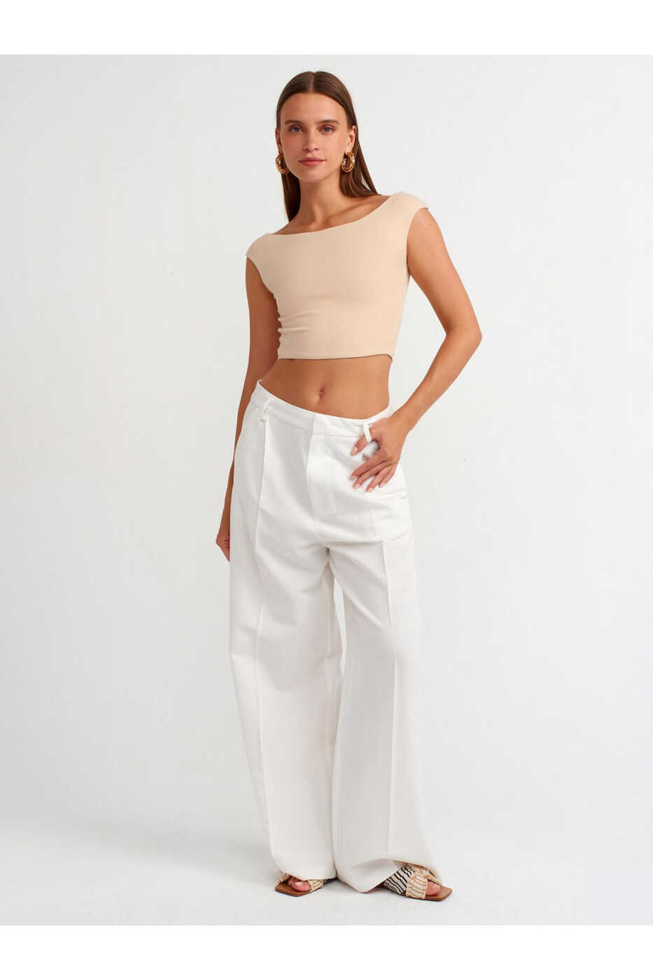 You can create a stylish look by combining the 20869 Boat Neck Crop Top with high-waisted trousers, skirts or shorts. You can also create a casual combination with jeans and sneakers for everyday wear. You can accentuate your style by complementing the crop top with accessories.