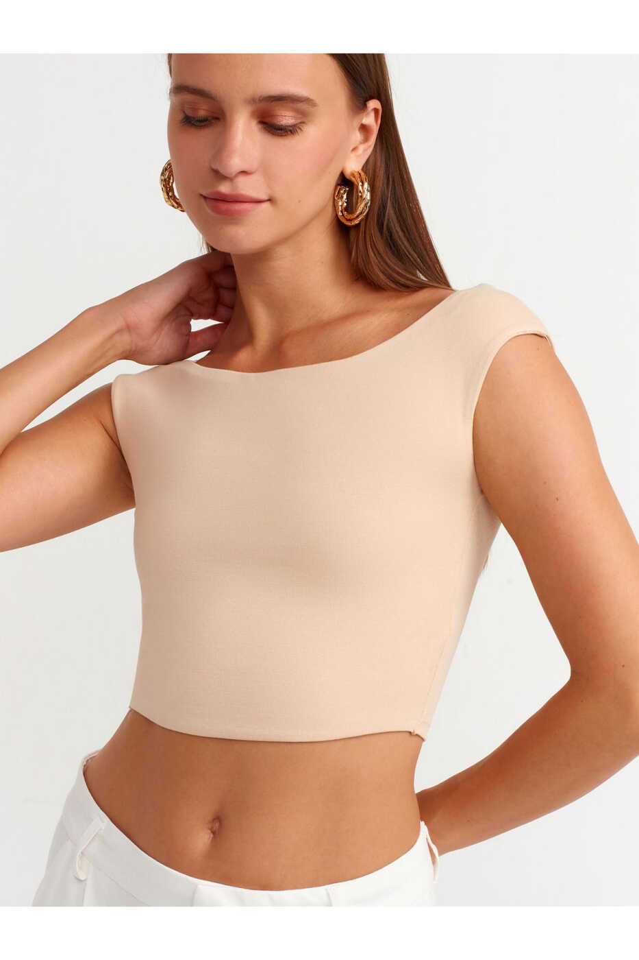 Combining style and comfort, the 20869 Boat Neck Crop Top will be an indispensable part of your wardrobe. This crop top, with its light beige color that will suit any combination, offers a sophisticated look with its boat neck and slightly loose fit design. Made from soft and breathable fabric, the crop top provides comfort throughout the day, while its short length creates a stylish accent on any outfit.