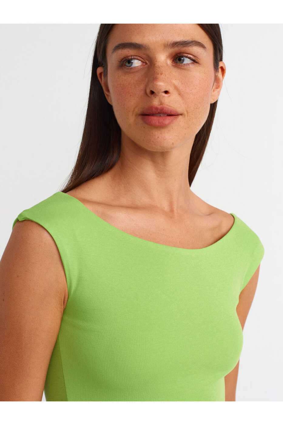 The 20869 Boat Neck Crop Top is a must-have for your wardrobe, combining style and comfort. This crop top, with its light green color, will easily blend in with any outfit and offer timeless elegance.