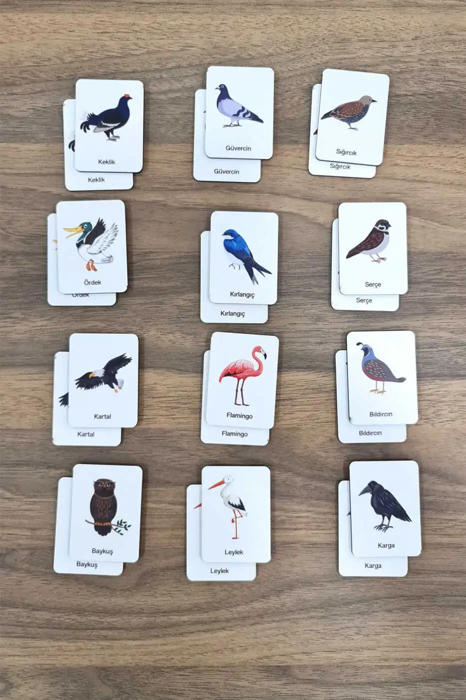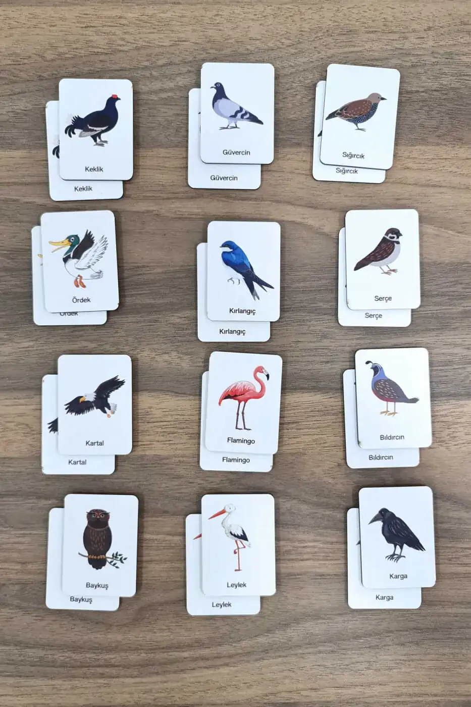 Эти красочные и привлекательные карточки состоят из пар, соответствующих друг другу, на которых изображены различные виды птиц. Дети пытаются найти соответствующие пары, переворачивая карточки. В этом процессе они развивают свое зрительное восприятие, память и навыки решения проблем. Простые правила игры и красочный дизайн делают ее легкой для понимания детьми и побуждают их играть.