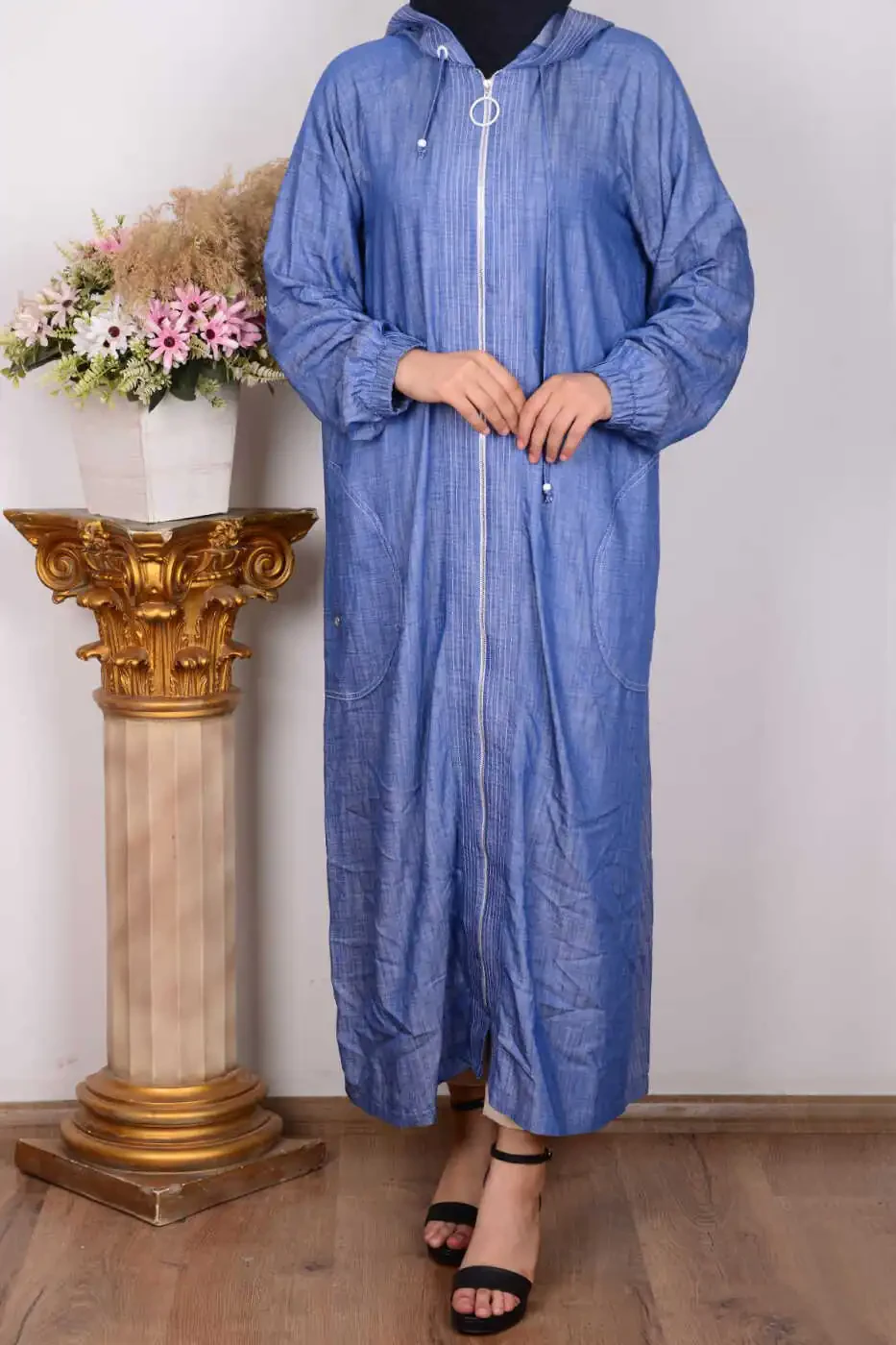 **24yt564 Indigo Ayollar Kapşonlu Chuqur Cho'ntak Tafsilotli To'liq Zipli Quloqlari Kauchuk Giychik**