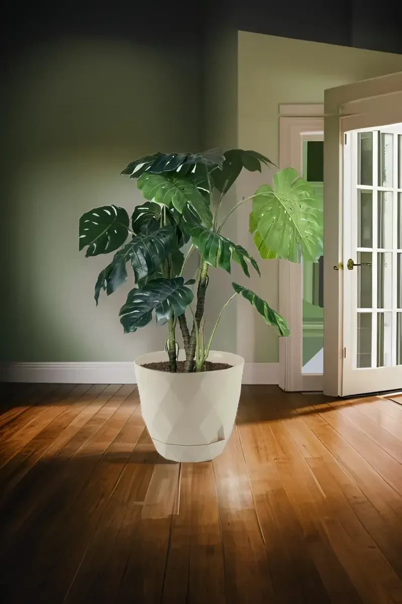 горшок, пластиковый горшок, декоративный горшок, большой горшок, горшок с поддоном, горшок с призматическим узором, бежевый горшок, yakamoz no7, садовый горшок, балконный горшок