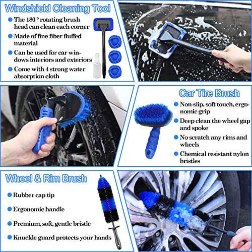 🚗【Professional 26 Pcs-in-1 Car Cleaning Kit】 The complete and decent car detailing kit equipped with 5 * detailing brush set, 4 * drill brushes, 3 * wire brush, 2 * vent cleaning brush, 1 * wheel brush, 1 * tire brush, 1 * detachable handle, 4 * of strong water absorption cloth cover and a 100ml spray bottle, 1 * dash duster brush, 1 * towel, 1 * car wash mitt, 1 * storage bag. Excellent completion of all works required for external and internal details! A gift for car buffs. 🚘【Drill Brush AttacModazoneent Set】4 pcs essential power scrubber attacModazoneents for washing automotive exterior and interior surfaces . This set has been expertly designed can also allows you clean bathroom surfaces, wheels, shower, toilet, kitchen, bathtub and carpet etc. The four brush heads allow you to easily scrub those hard to reach or large surfaces. Truly a perfect way to make every nook and cranny of your house & car absolutely spotless! 🚙【1 x Long Handle Car Wheel Brush & 1 x Short Handle Car Tire Brush】Our 17" long handle wheel rim brush can easily extend into the inner wheel, wheel hub, alloy wheel groove, and any other hard-to-reach areas. Soft bristles will not cause scratches yet strong enough to clean the brake dust and dirt off the wheels. Tire cleaning brush makes quick work of intricate rims and wheels. The heavy duty great non-slip handle is with raised drops, which provide the perfect grip and easy holding. 🏍【5 x Car Detailing Brush & 3 x Wire Brushes 】 5 Different Sizes Car Detailing Brushes can meet any cleaning needs of small cracks, corners, lug nuts, wheels, vents, car seats, engine compartments, dashboards, signs, etc. 3 pcs wire brushes including 1 stainless steel brush, 1 brass brush, and 1 nylon brush. Wire Brush of different materials is suitable for different surface types, they will address all your cleaning concerns. 🚲【Soft Car Washing Tool Kit】 The car window cleaner tool served with 1 detachable handle, 4 of strong water absorption cloth cover and a 100ml spray bottle, The 180 ° rotating brush head can clean each corner. The dash duster brush to sweep dust particles easily. The car wash towel and car wash mitt are soft which made them easy to apply cleaner & polish.