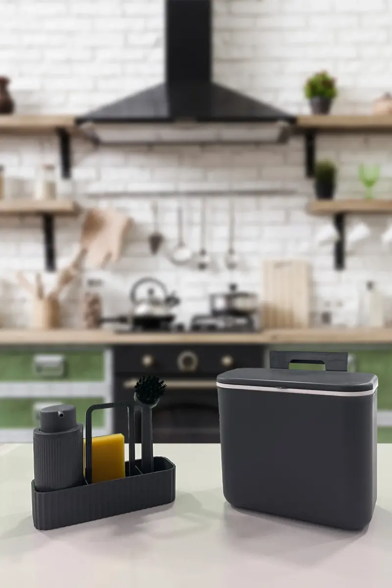 2'li Bulaşık Seti Vailo Ve 8 Lt Mutfak Tezgah Üstü Ve Dolap Askılı Çöp Kovası Gri Mutfak Seti-Gri