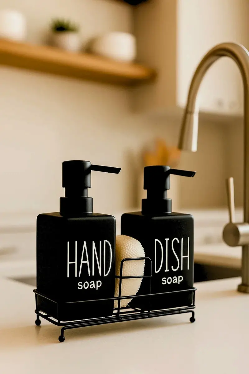 2'li Metal Stantlı ve Süngerli Kare Sıvı Sabunluk Mutfak Seti, Hand and Dish Fenomen Set 400 ML-Kare Siyah