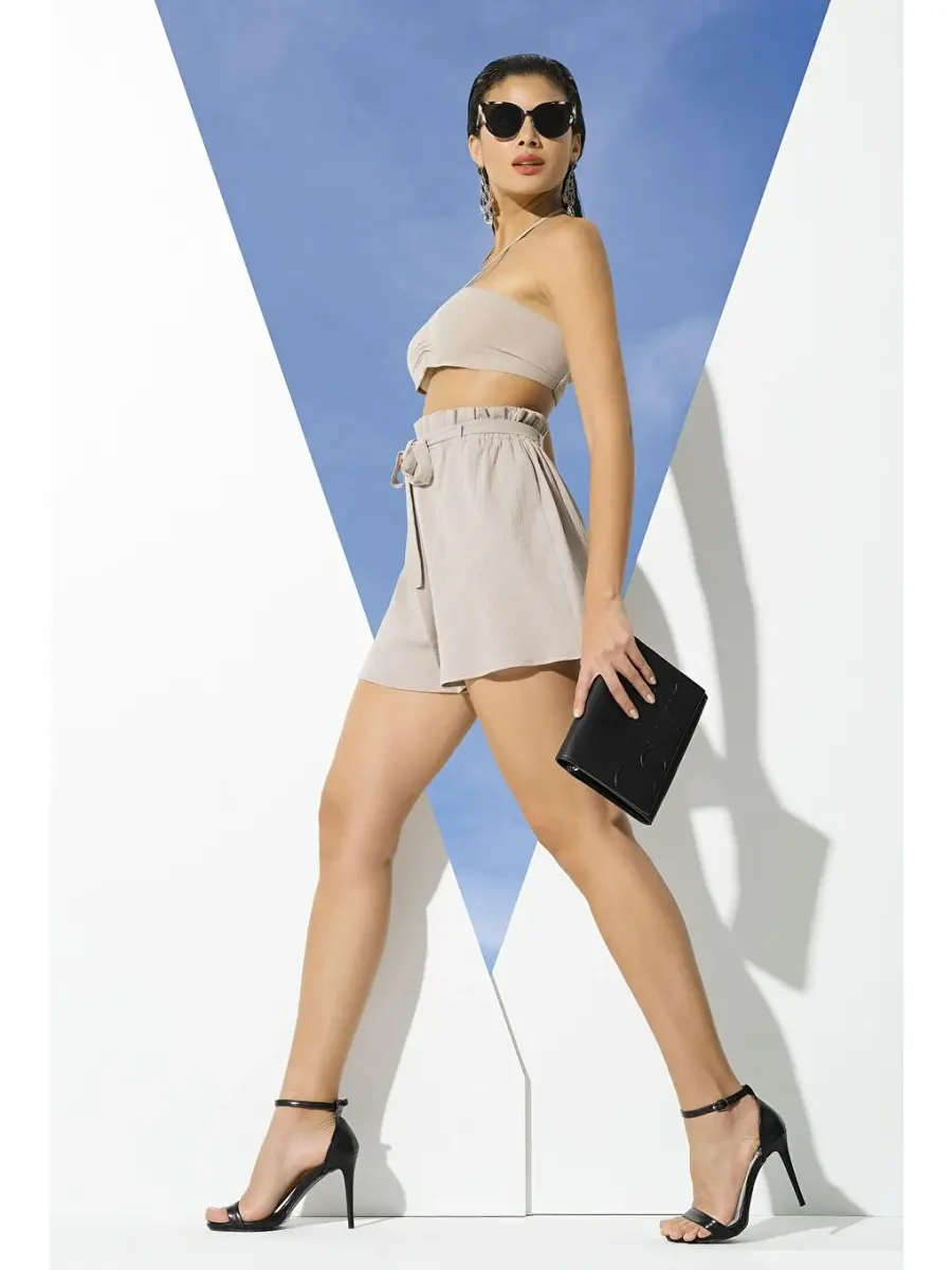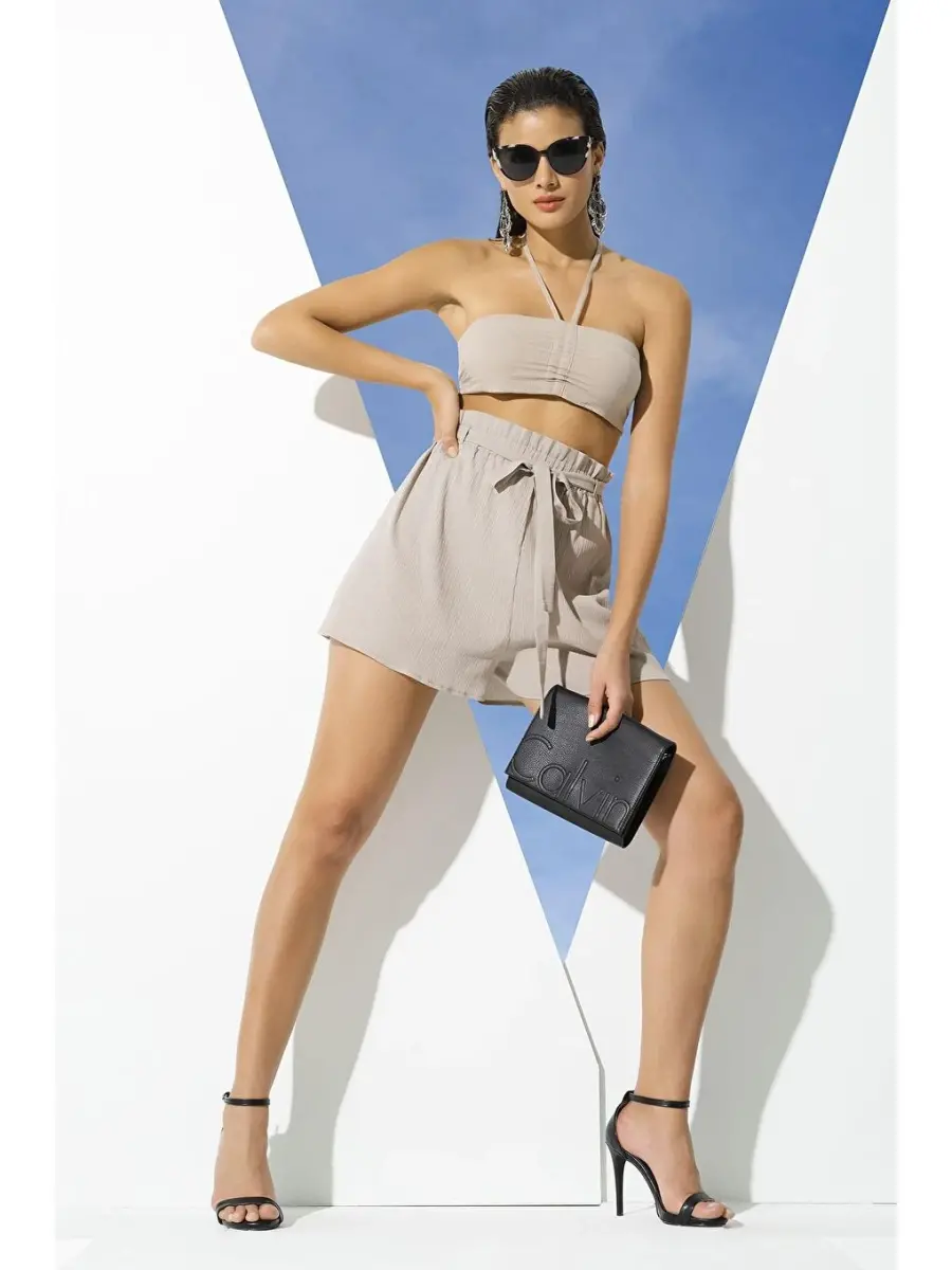 Organik İpli Taşlı Bustiyer Şort Takım - Bej | For You Moda