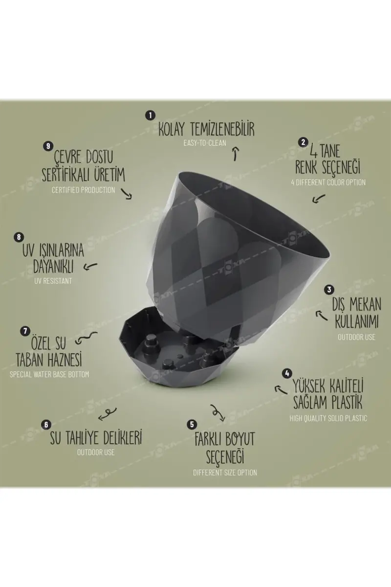 Bu ürün ToXA Store tarafından gönderilecektir.Kampanya fiyatından satılmak üzere 100 adetten fazla stok sunulmuştur.İncelemiş olduğunuz ürünün satış fiyatını satıcı belirlemektedir.Bir ürün, birden fazla satıcı tarafından satılabilir. Birden fazla satıcı tarafından satışa sunulan ürünlerin satıcıları ürün için belirledikleri fiyata, satıcı puanlarına, teslimat statülerine, ürünlerdeki promosyonlara, kargonun bedava olup olmamasına ve ürünlerin hızlı teslimat ile teslim edilip edilememesine, ürünlerin stok ve kategorileri bilgilerine göre sıralanmaktadır.Bu üründen en fazla 10 adet sipariş verilebilir. 10 adedin üzerindeki siparişleri Trendyol iptal etme hakkını saklı tutar. Belirlenen bu limit kurumsal siparişlerde geçerli olmayıp, kurumsal siparişler için farklı limitler belirlenebilmektedir.15 gün içinde ücretsiz iade. Detaylı bilgi için [page="return_conditions"]tıklayın .Prizma desenli yuvarlak formu ile modern ve şık bir görünüm sunar.Drenajlı ve tabaklı bir saksı modelidir.Her türlü iç mekan dekorasyonuyla uyum sağlarDayanıklı plastik materyali sayesinde uzun ömürlü kullanım vaat eder ve kolay temizlenebilir özelliğiyle pratiklik sağlarBaklava desenli yapısı ile estetik bir dokunuş ekler, bitkilerinizi ön plana çıkarır ve mekanınıza zarif bir hava katar22cm çapı 19,3 cm. boyutlarındaki geniş iç hacmiyle 4,8 litrelik kapasitesi, büyük bitkileriniz için idealdir