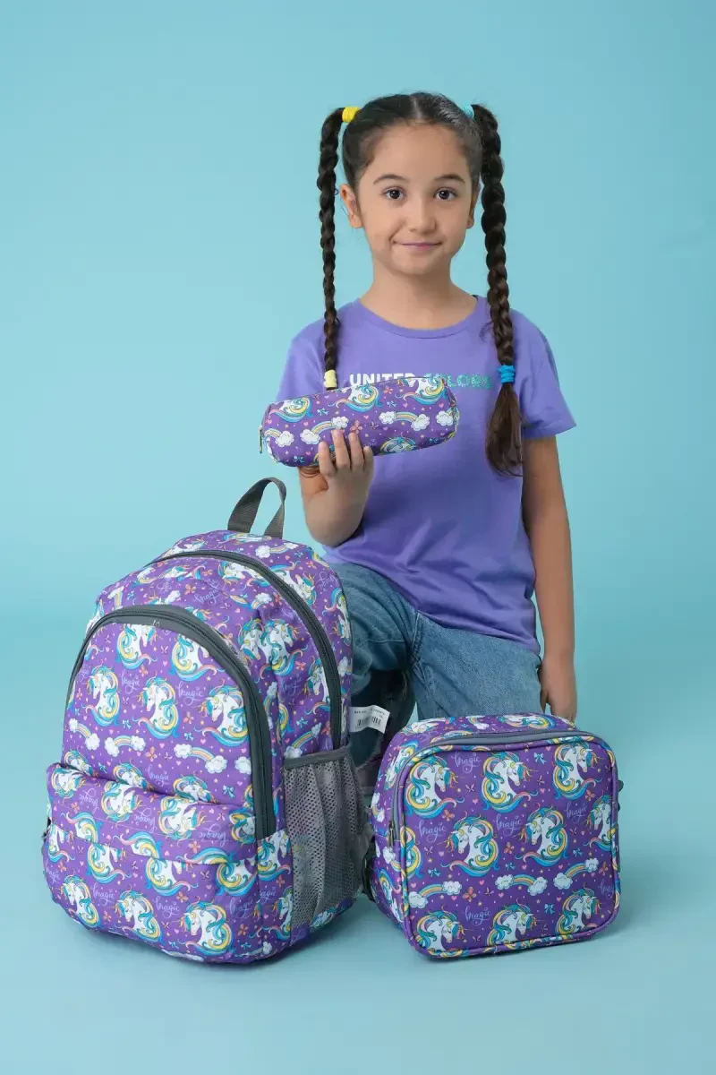 Note: Do not wash by hand or in the machine! You can clean it with the help of a damp cloth. The 3-piece set includes 1 elementary school backpack, 1 lunch bag, and 1 pencil case.