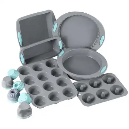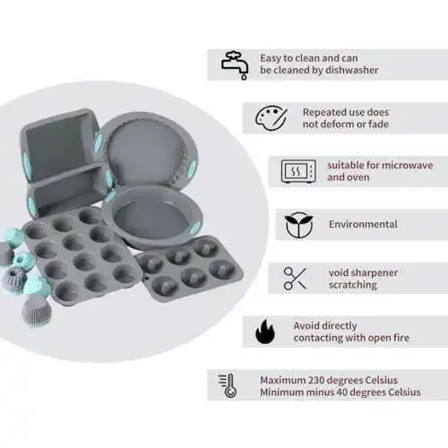 【High Quality Material】- The bakeware baking set are made of food grade silicone, is more flexible and durable. 【Multiple Use Silicone Bakeware Set】: 30 Pcs Silicone Nonstick Baking Pans sets: Cookie sheet x 1, 12 Cup muffin pan x 1, Round cake pan x 1, Pizza pan x 1, Loaf pan x 1, 6 Cavity dount pan x 1, 3 shapes Silicone baking cups x 24. Perfect for preparing baking doughnuts, muffin cupcakes, and bread, baking birthday cake, layer cakes, cheesecakes, coffee cake, cornbread, and more. 【Non-stick and Heat-Resistant】The smooth internal surface of the silicone baking set can make demolding very easy, if you could brush some oil before using, the demolding effect would be much better, Temperature safe from -40to +446°F/ (-40 to +230°C), the bakeware set silicone mold are Oven - Microwave - Freezer - Dishwasher Safe. Ideal for parties, birthday parties, celebrations, etc, spend a fun day with family, friends, and guests. 【Easy to Use】- Place the cups or pans on the cookie sheet, fill and bake. With our pan, there is no need for sticky cooking spray or messy wrappers. You can easily pop out food from all pans without harming its appearance. 【Easy to Clean】: The silicone bakeware set inside bright finishing, it is easy to clean and separate with cake. After using, soak baking cups in warm soapy water. Any leftover crumbs will turn into mush and can easily be washed out with a soft cloth. The silicone bakeware molds is much easier to clean than traditional metal or aluminum bakeware, simply rinse with hot water or use the dishwasher!