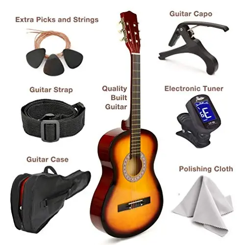 30 Inch Guitar with nylon strings is designed for beginner or younger player, ideal for kids, girls, boys, children, teens and beginner. Right Handed design, Linden Binding & Body, hardwood neck offers you a comfortable feeling and excellent playing ability. The guitar features a full scale 30 inch size, suitable for students, kids and beginner. Carefully crafted with Linden wood, deliver a smooth and full tone for beginner. Well made traditional body delivers a focused sound with sweet highs and tight lows. High quality brass machine head keeps the guitar always in tune, and the truss rod inside the neck allows you to adjust the action of the guitar. Guitar package includes: 30" guitar, Gig bag, Tuner, Strap, Picks, Cleaning cloth.
